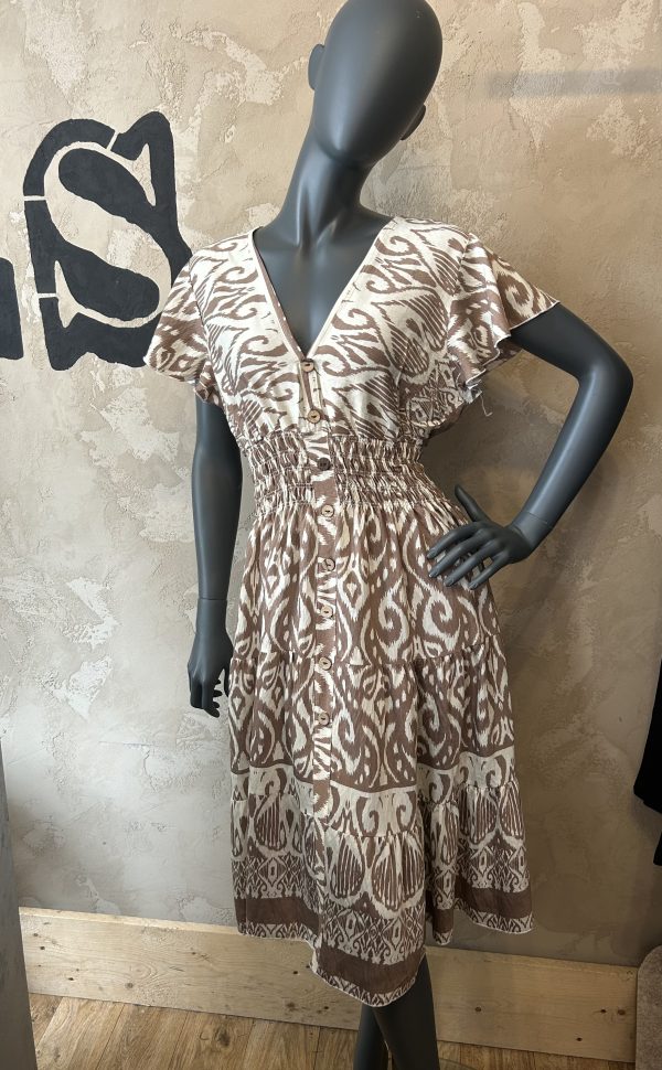 Our lightweight cotton midi length angel sleeve dress in mocha has button front detail and elasticated waist. This stunning dress has a beautiful Aztec contrast print and 2 side pockets. One size fits 10- 16/18
