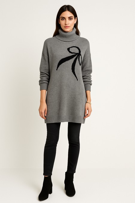 Our cosy roll neck jumper can be worn as a jumper, if you are taller, but if you are shorter this one can be worn as a dress with thick tights/leggings.  Available in grey or chocolate.  One size fits 10-16,