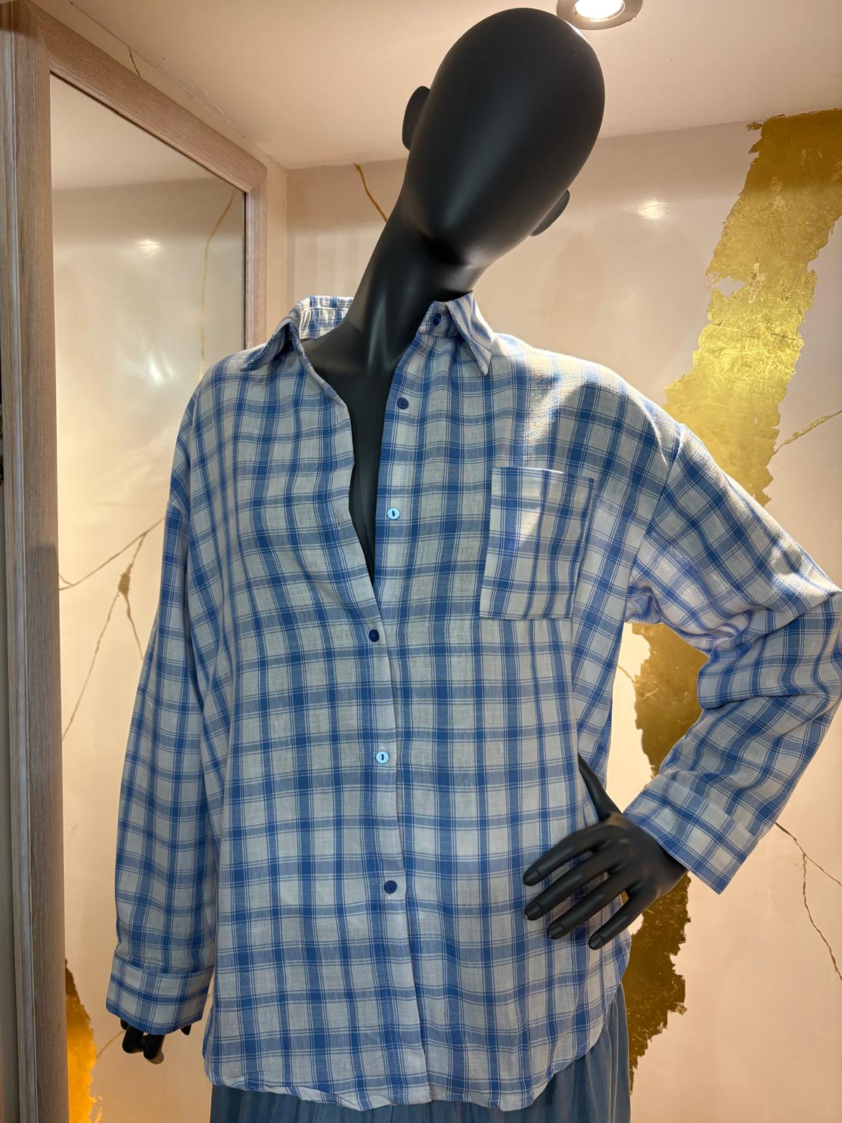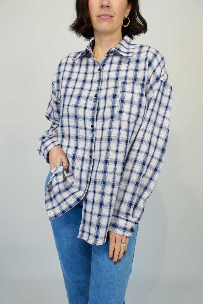 An oversized boyfriend fit long sleeved cotton shirt in a coloured check print with a single upper pocket and button front. Available in dark or light blue. Sizes S/M (10-14) and L/XL (14-18)