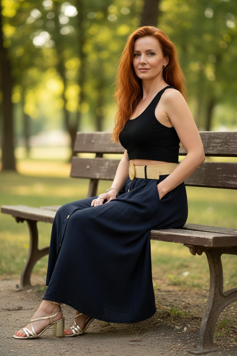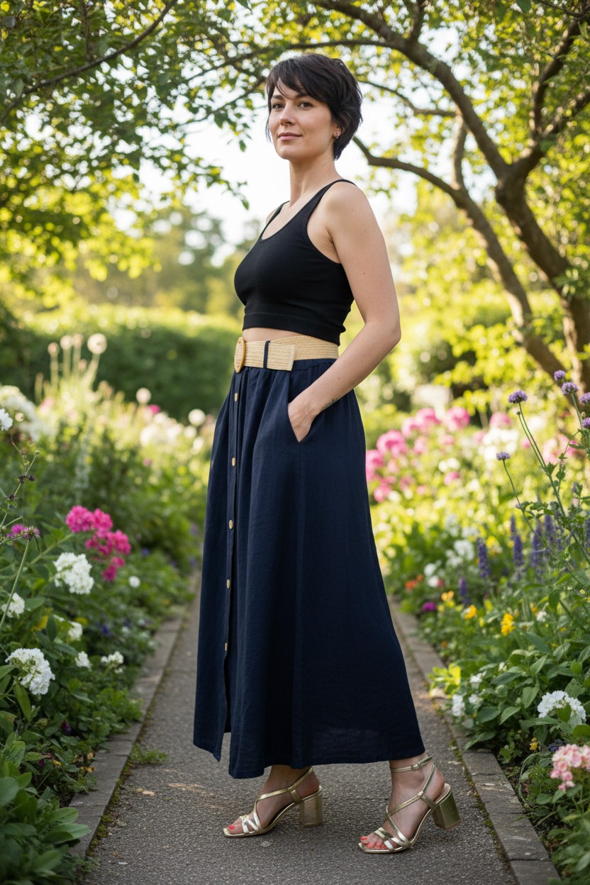 This elegant skirt is crafted from a lightweight, airy fabric in a soft cream hue that whispers sophistication. The silhouette is flowy and full-length, offering graceful movement with every step. A series of buttons runs down the front, adding a touch of classic charm and versatility. The skirt has an elasticated waist with a wide, textured belt featuring a large statement buckle, perfect for accentuating the waistline. Ideal for sunny outings or casual evenings, pair this versatile piece with a simple black top and strappy sandals for an effortlessly chic look. Available in one size 10-14 and in black, navy or stone.