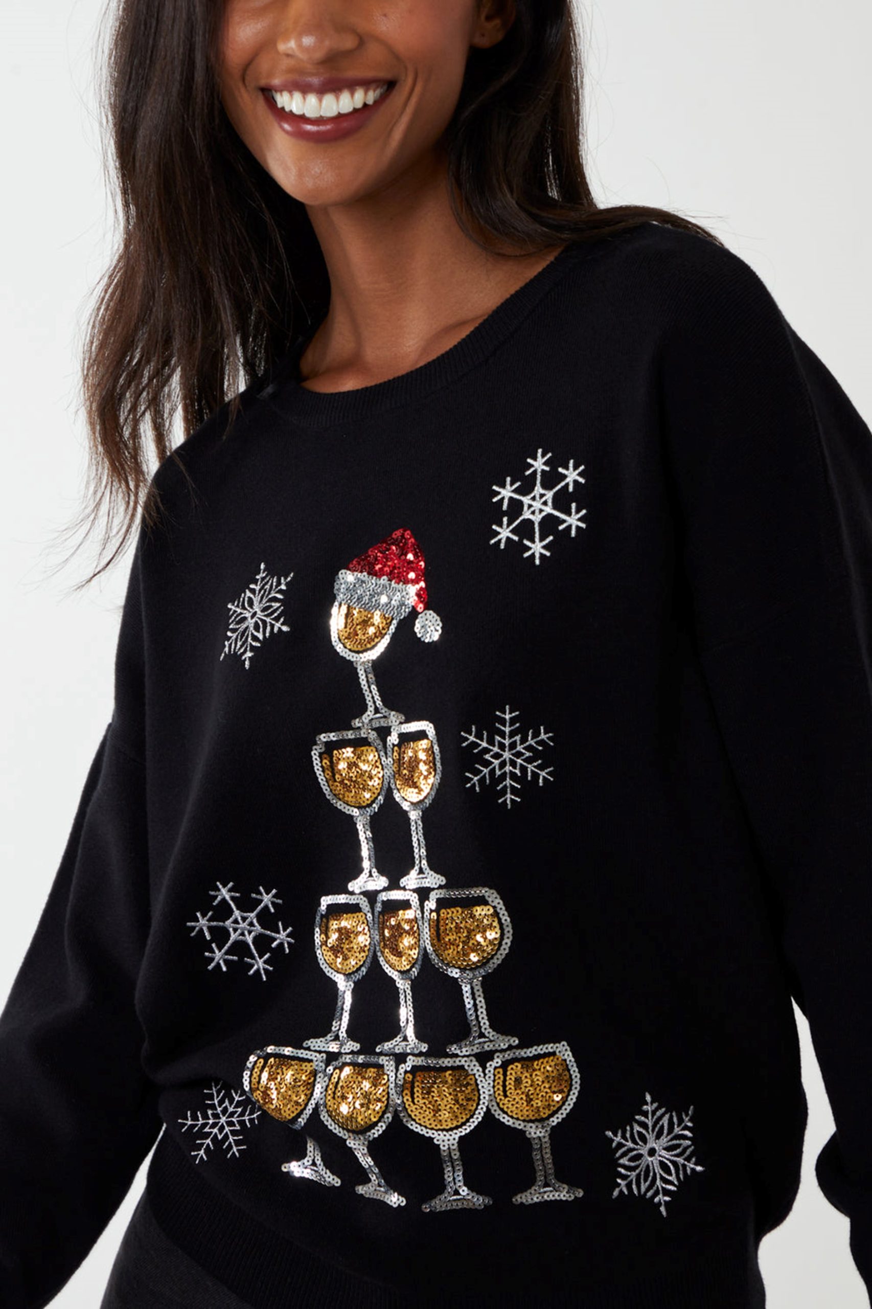 An unusual Christmas jumper featuring a sequin champagne tower surrounded by snowflakes. The jumper is a lovely soft black knit. Available in sizes S/M and M/L.