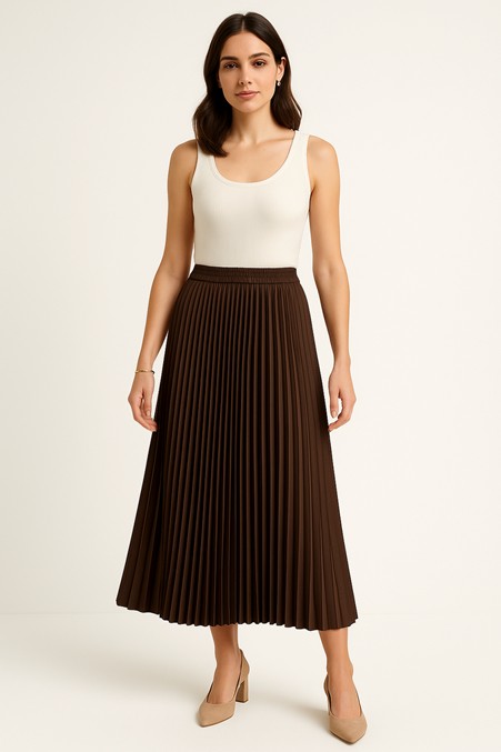 Our pleated knitted skirt in rich chocolate is a great essential addition to your wardrobe. One size fits 10-14.