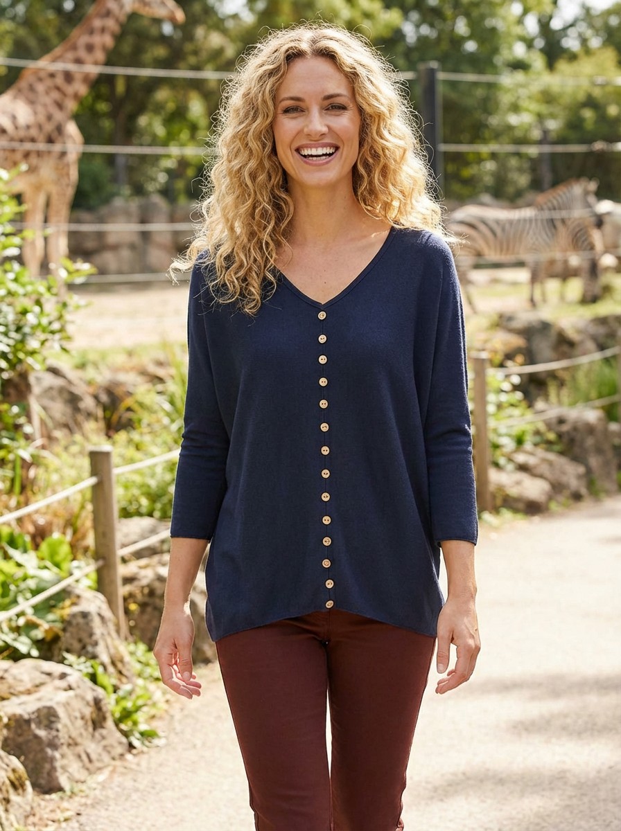 This elegant lightweight jumper features a relaxed, oversized silhouette that drapes effortlessly, making it perfect for cosy yet chic styling. Crafted from a soft knit fabric, it offers a comfortable and warm feel against the skin. The standout detail is the line of wooden buttons that run vertically down the centre, adding a touch of rustic charm and visual interest. Its deep V-neckline enhances the casual vibe, making it ideal for layering over a camisole or pairing with your favourite jeans for a polished, laid-back look. Whether for a relaxed day at home or a casual outing, this sweater effortlessly combines style and comfort. Available in Black or Navy. One size fits 10-16.