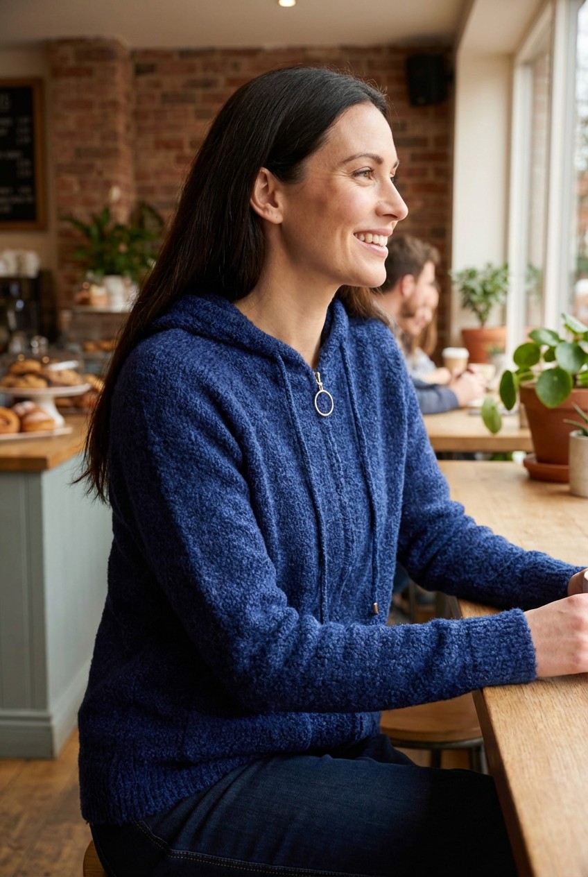 Our cosy hoodie features a plush, textured fabric that offers both warmth and style. The relaxed fit is complemented by ribbed cuffs and hem, ensuring a snug yet comfortable silhouette. An adjustable drawstring hood and a prominent circular zip pull add functional flair, while the 2 front pocket provides practicality and a casual vibe. Perfect for layering on a cooler day, this hoodie pairs effortlessly with jeans or leggings for a laid-back, everyday look. Ideal for casual outings or lounging at home, it brings a touch of comfort and elegance to any wardrobe. Available in navy or pink. Sizes M/L (12-16) and L/XL (16-20)