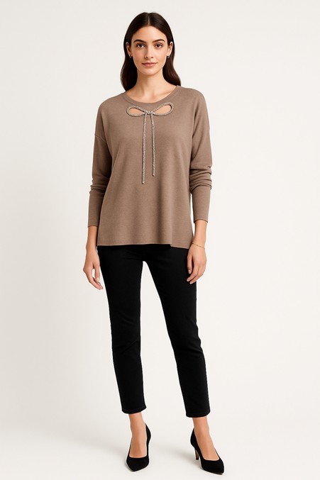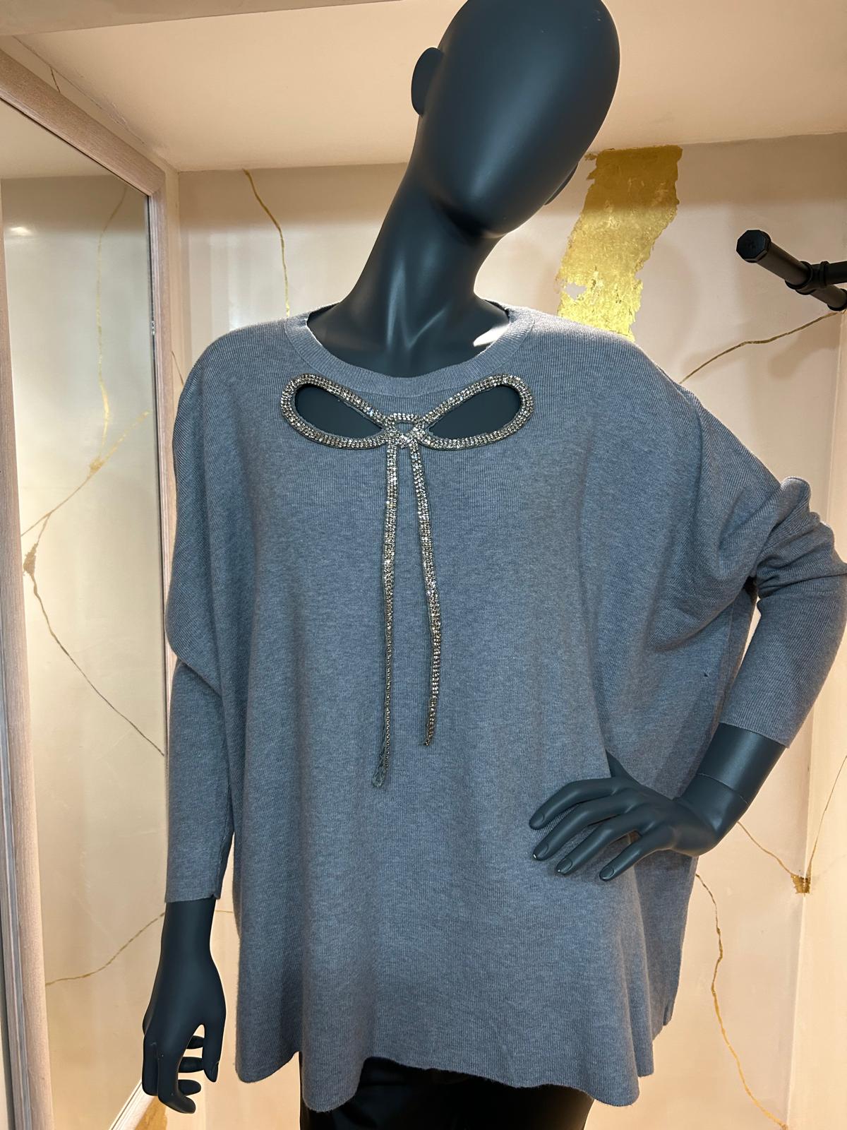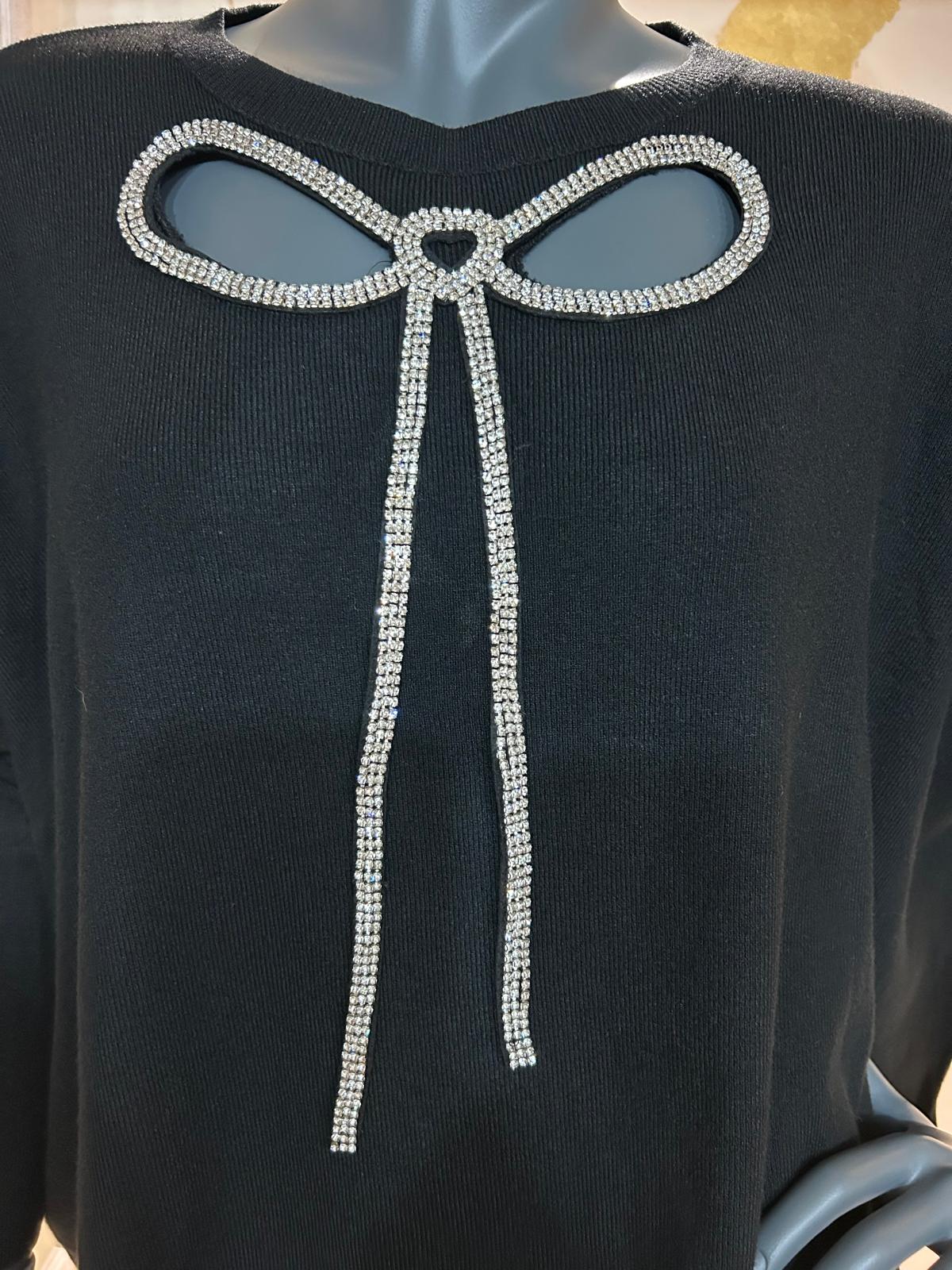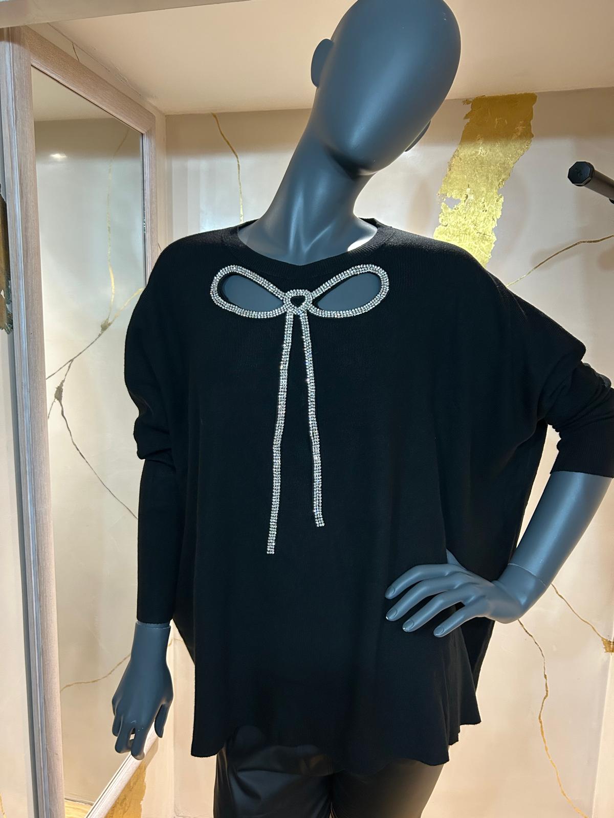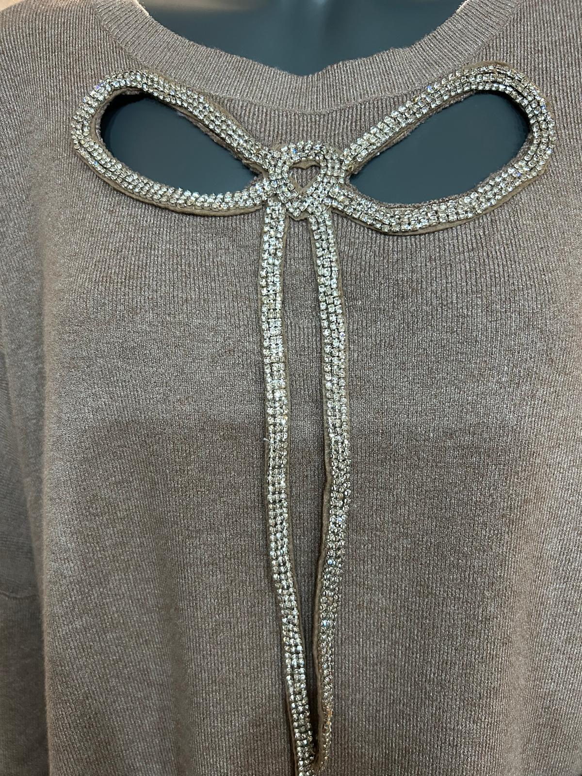 A perfect one for a touch of glamour. This gorgeous jumper has cut out detail with diamante bow. Available in wine, cream, mocha, black and grey. One size fits 14-20.