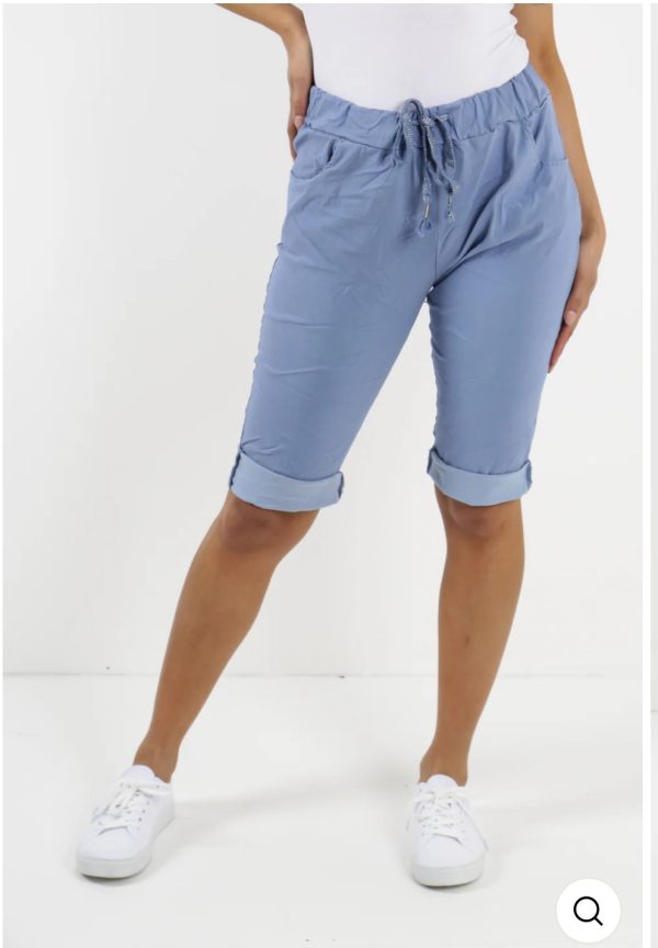 Our magic trousers are now available in a Shorts Version. These fabulous super stretchy shorts have 2 side pockets and tie waist detail. One Size 16-24. Available in Black, Denim Blue, Beige or Navy.
