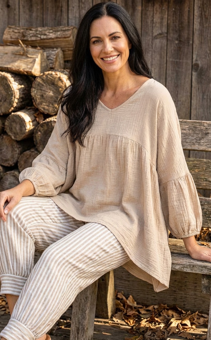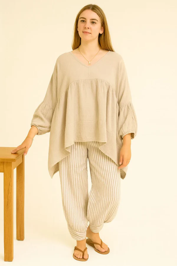 This loose-fitting top is crafted from a soft, textured fabric exuding a relaxed and comfortable vibe. Its flowing silhouette features a high-low hemline, adding a touch of modern flair, while the voluminous three-quarter sleeves gathered at the cuffs provide an airy, bohemian appeal. The V-neckline offers a flattering frame for the neckline, perfect for pairing with delicate jewellery. Ideal for casual outings or lounging at home, this top pairs beautifully with leggings or fitted trousers for a balanced look. Its effortless style makes it a versatile piece for layering or wearing on its own. Available in beige, pink or black. One size 16-26.