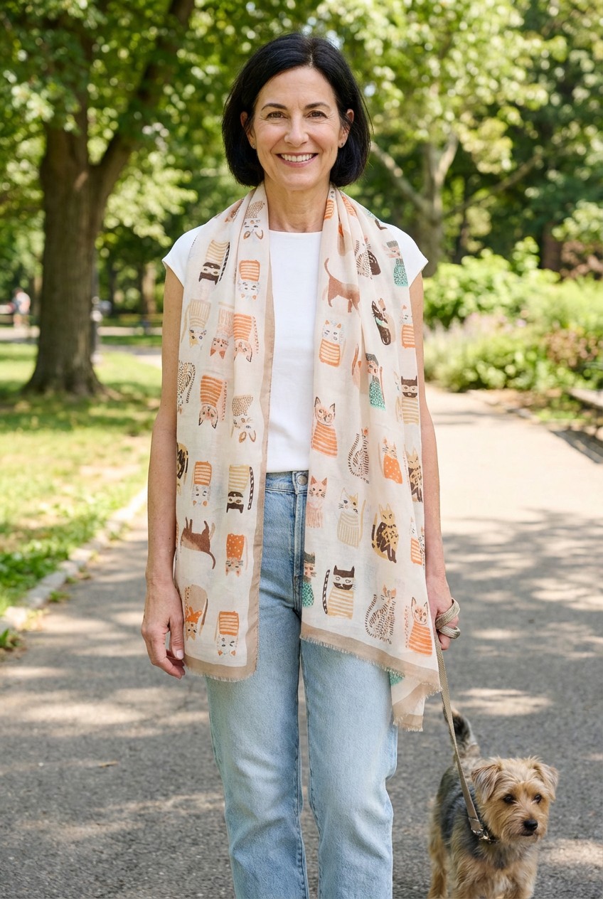 Our Cat scarf is crafted from a lightweight, airy fabric, perfect for adding a playful touch to any outfit. Its soft beige or navy background is adorned with an array of cute, colourful cat illustrations, each feline sporting different expressions and patterns. The scarf’s generous length allows it to be styled in multiple ways, whether draped elegantly over the shoulders or wrapped snugly around the neck. Finished with subtly frayed edges, this accessory exudes a casual, artistic charm. Ideal for casual outings or adding a quirky flair to a work ensemble, it pairs effortlessly with jeans and a simple top. Available in beige or navy.