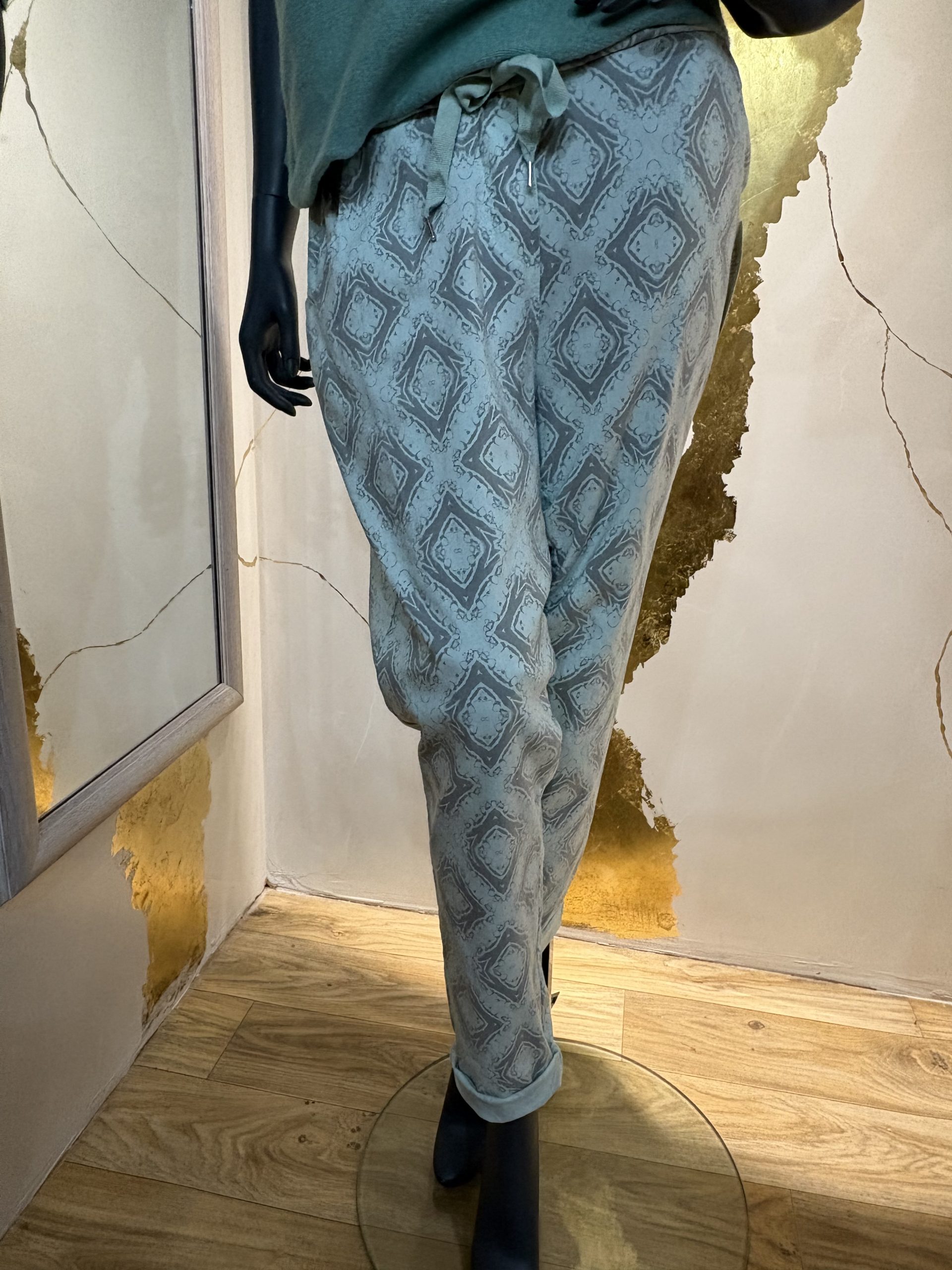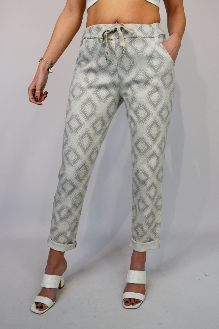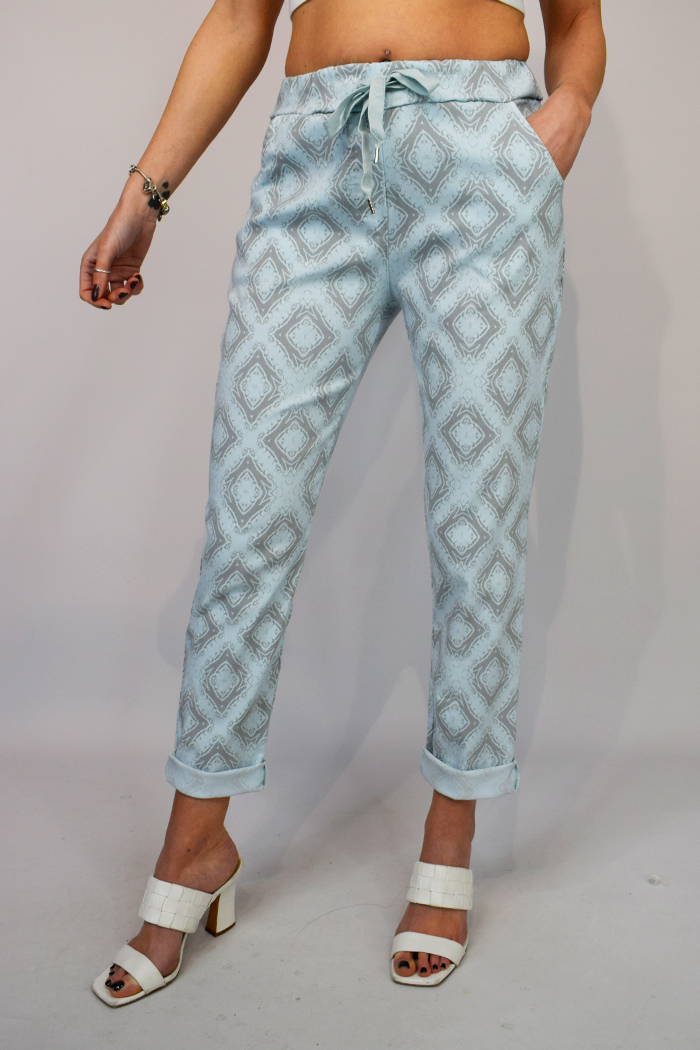 Our ever popular stylish magic trousers are back with new prints. These fabulous trousers feature diamond print, seam detail to the rear and tie waist. One size fits 10-14 Available in blue, stone or aqua.