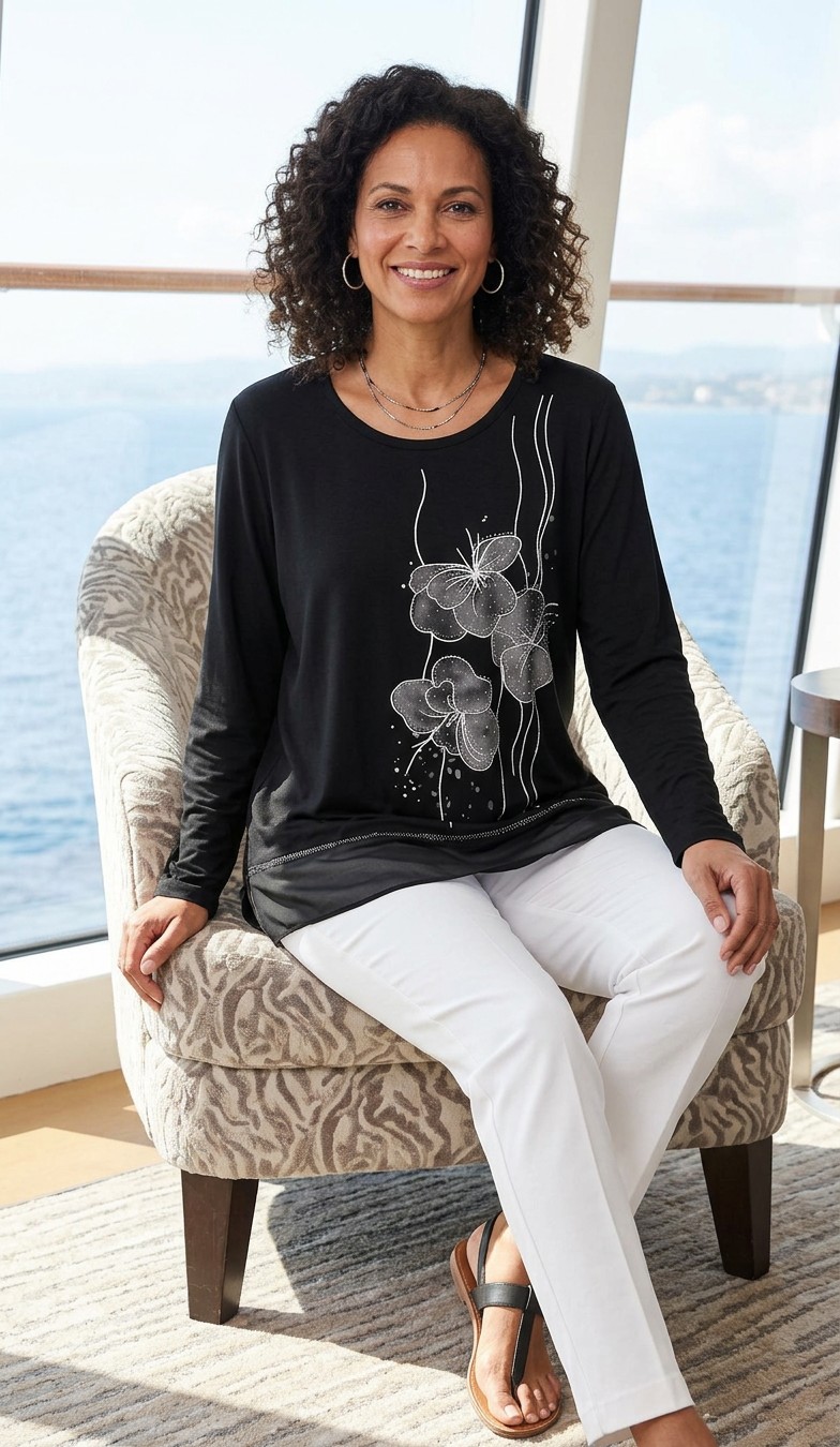 This elegant black tunic showcases a flowing silhouette that drapes gracefully for a relaxed yet sophisticated look. Crafted from a soft, lightweight fabric, it features a delicate floral design in white, adding a touch of artistry and contrast to the garment. The long sleeves and round neckline provide a classic and versatile style, making it suitable for both casual and dressier occasions. Subtle stitching accents along the hem enhance its refined appeal. Pair it with tailored trousers or leggings for an effortlessly chic ensemble. Available in one size fitting 12-20.
