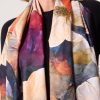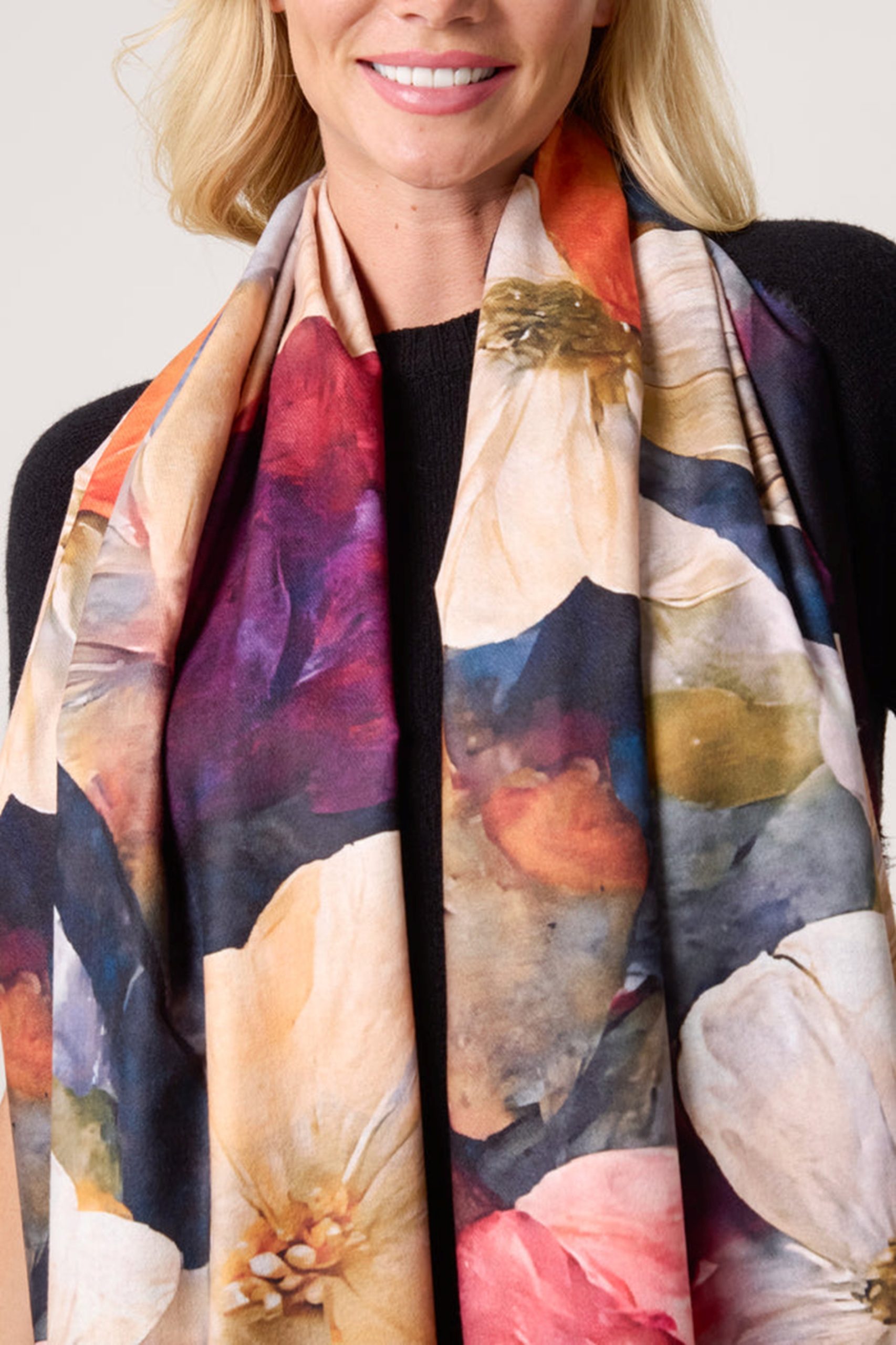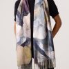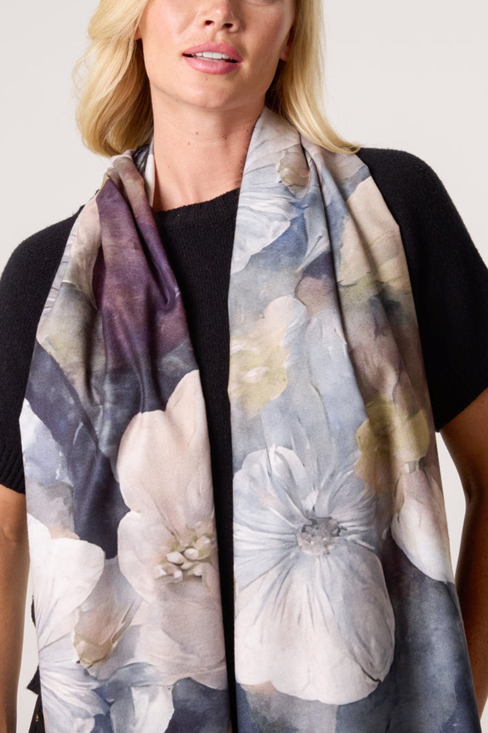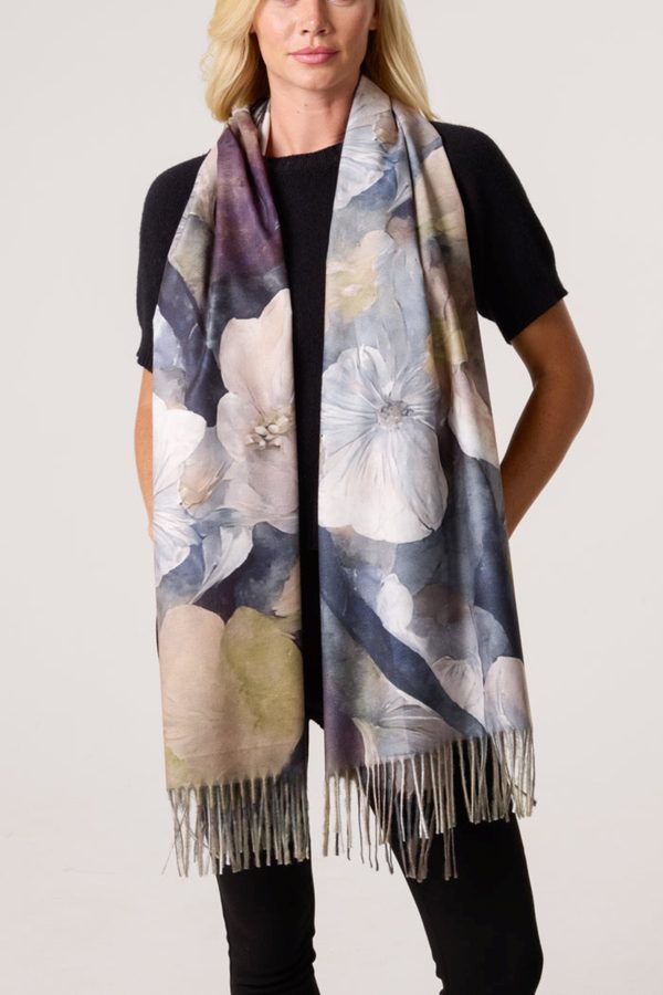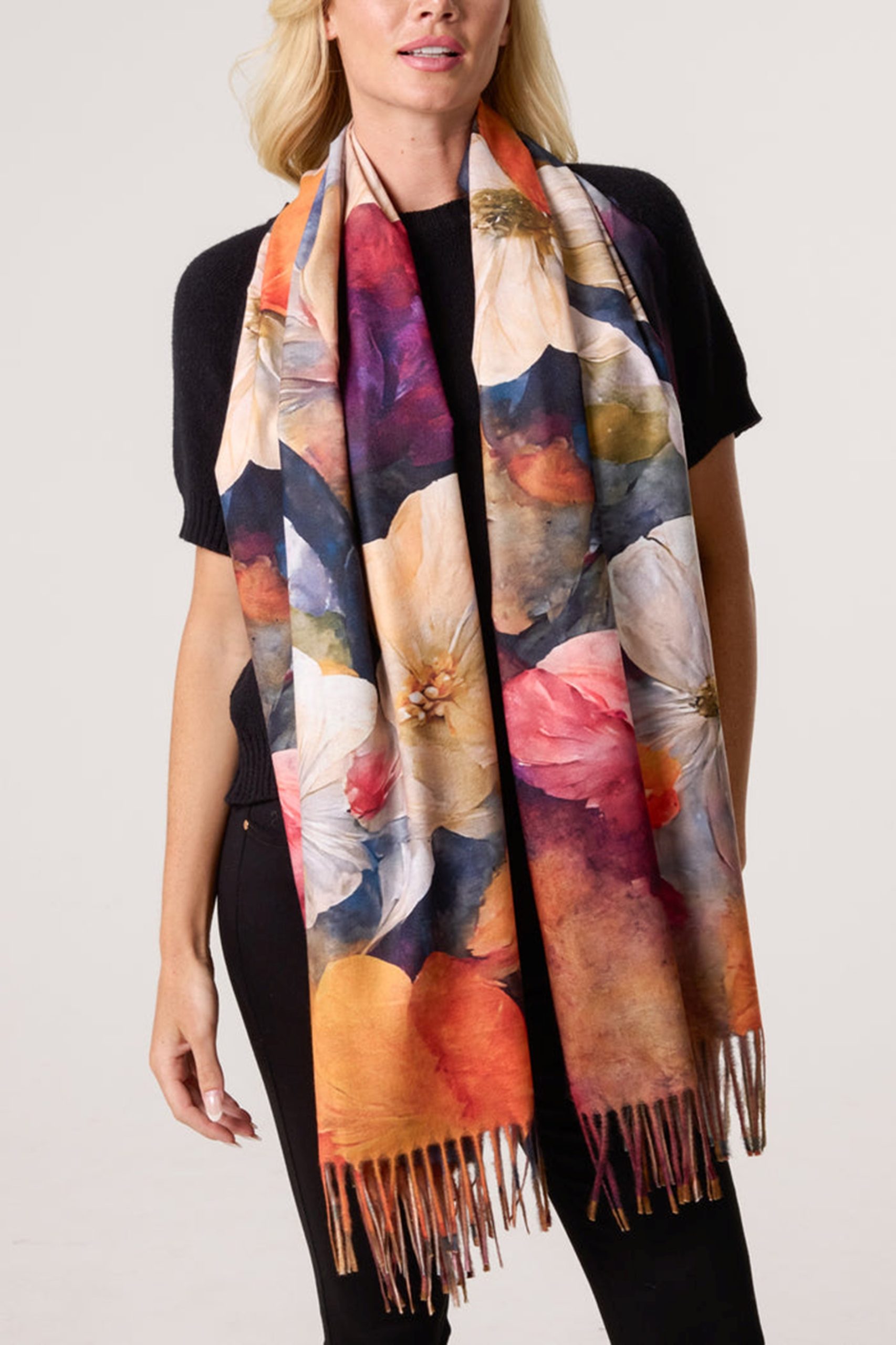 Our stunning fringed scarf features either blue/grey floral print or orange/pink floral print.