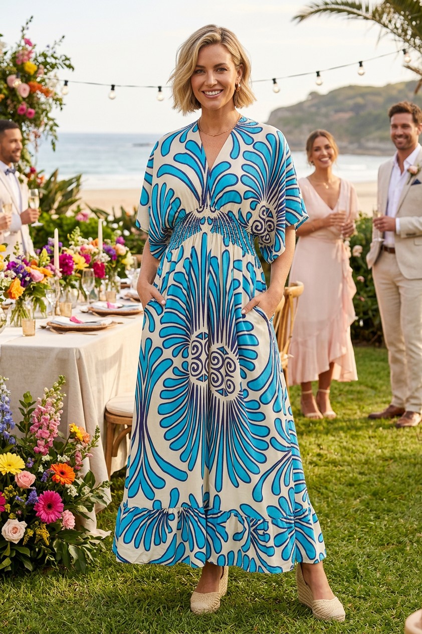 Our vibrant Italian jumpsuit is a statement piece featuring a striking pattern that evokes a sense of tropical allure. Crafted from lightweight fabric, it drapes effortlessly, offering a relaxed yet elegant silhouette perfect for warm, breezy days. The dress is adorned with a deep V-neckline and wide, flowing short sleeves, enhancing both comfort and style. Its elasticated waistband provides a flattering fit, while the subtle ruffle detail at the hem adds a playful touch. Ideal for beach outings or casual summer gatherings, pair it with strappy sandals and minimal accessories to let the bold print shine . Available in blue or black print. 100% viscose and available in one size 8 – 14.
