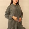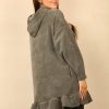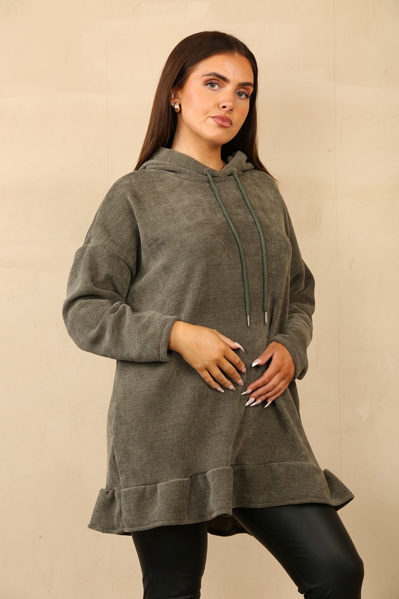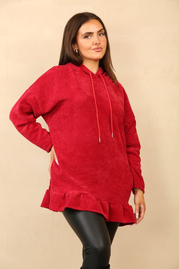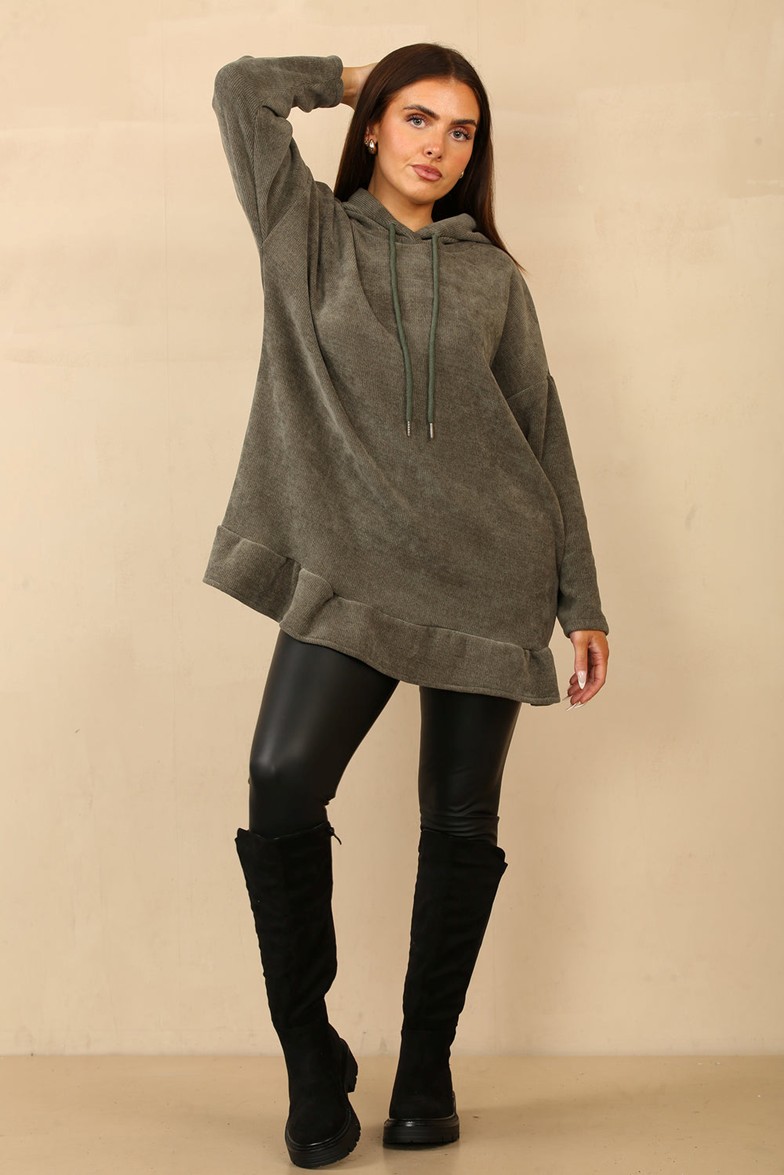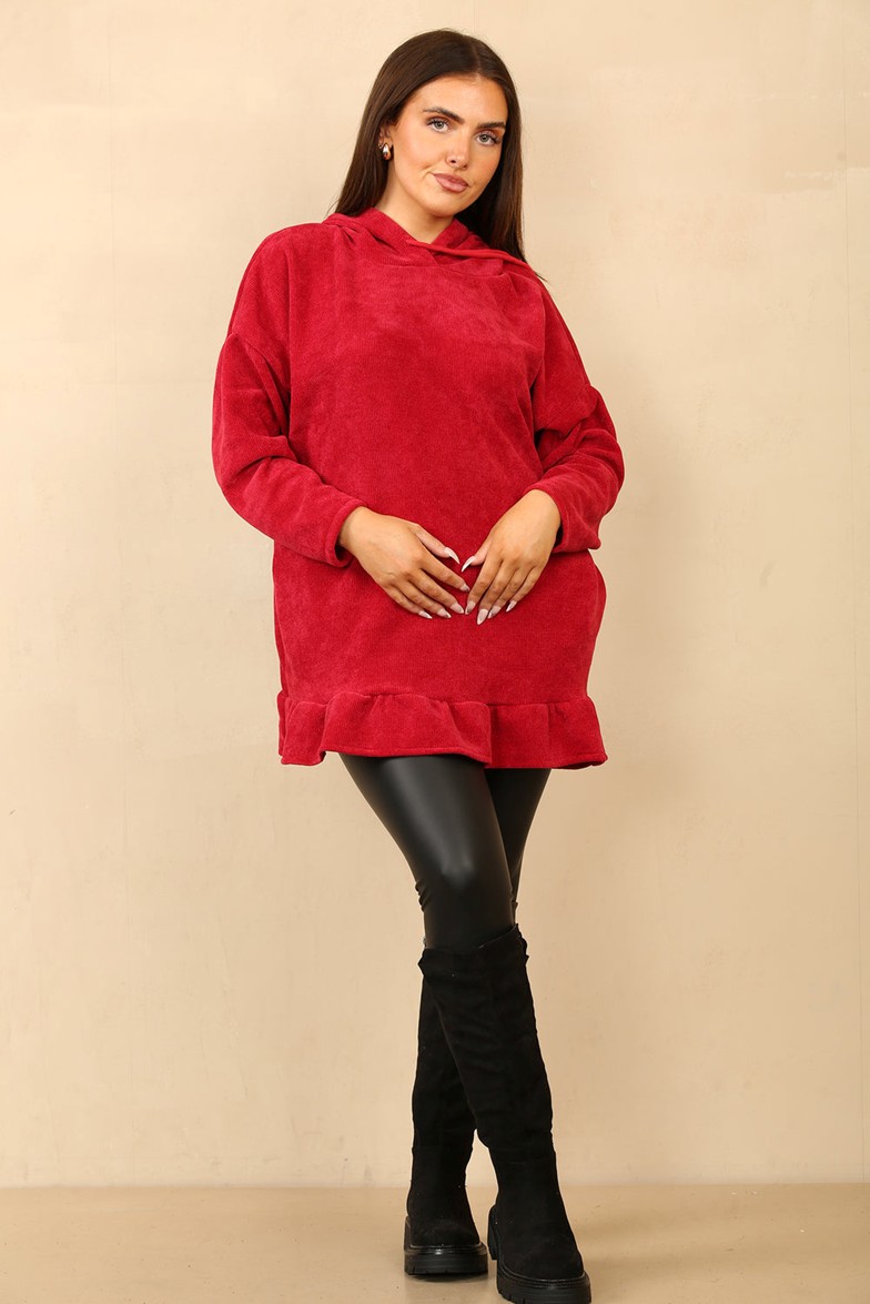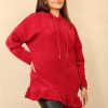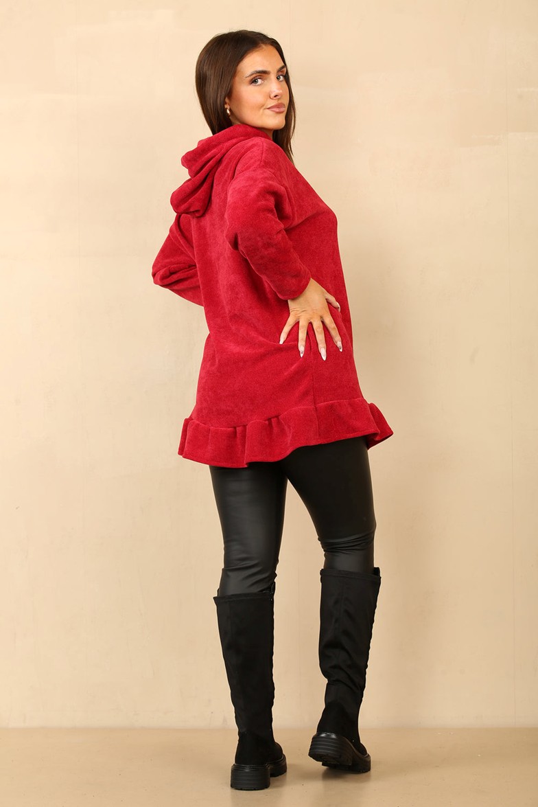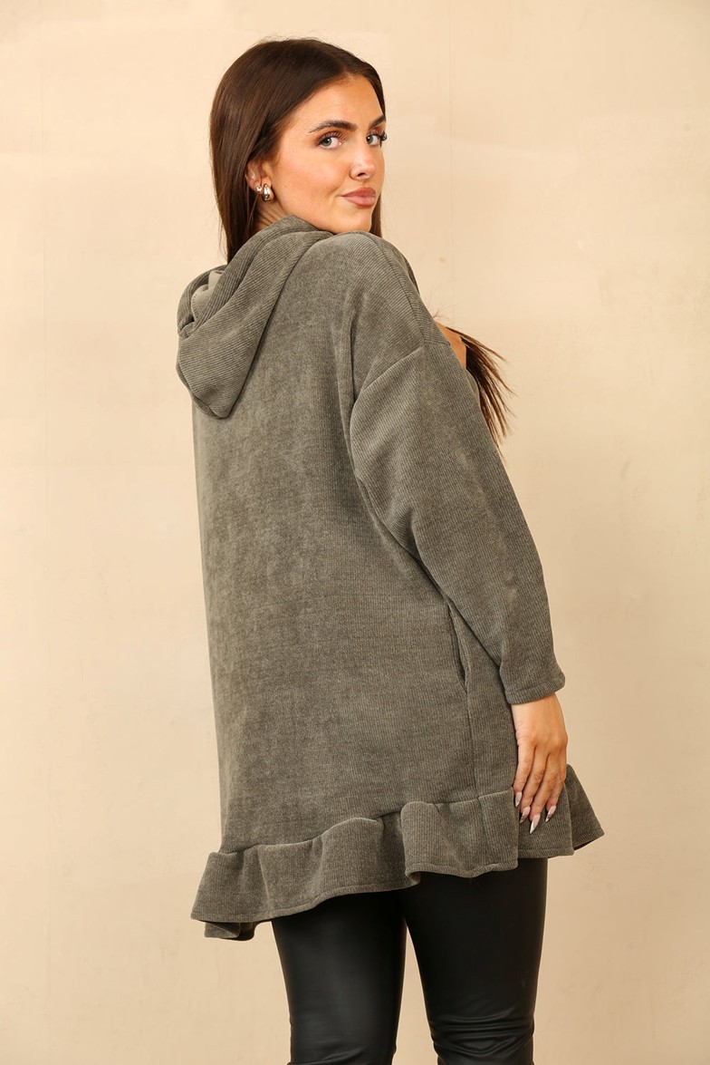 This gorgeous velour ribbed hoodie has a tie front and frill to the hem.  Super soft and available in red, khaki or black.  One size fits 10-16.