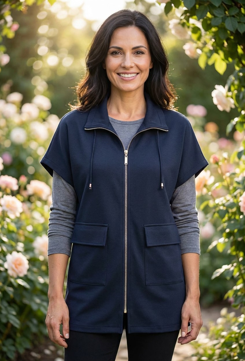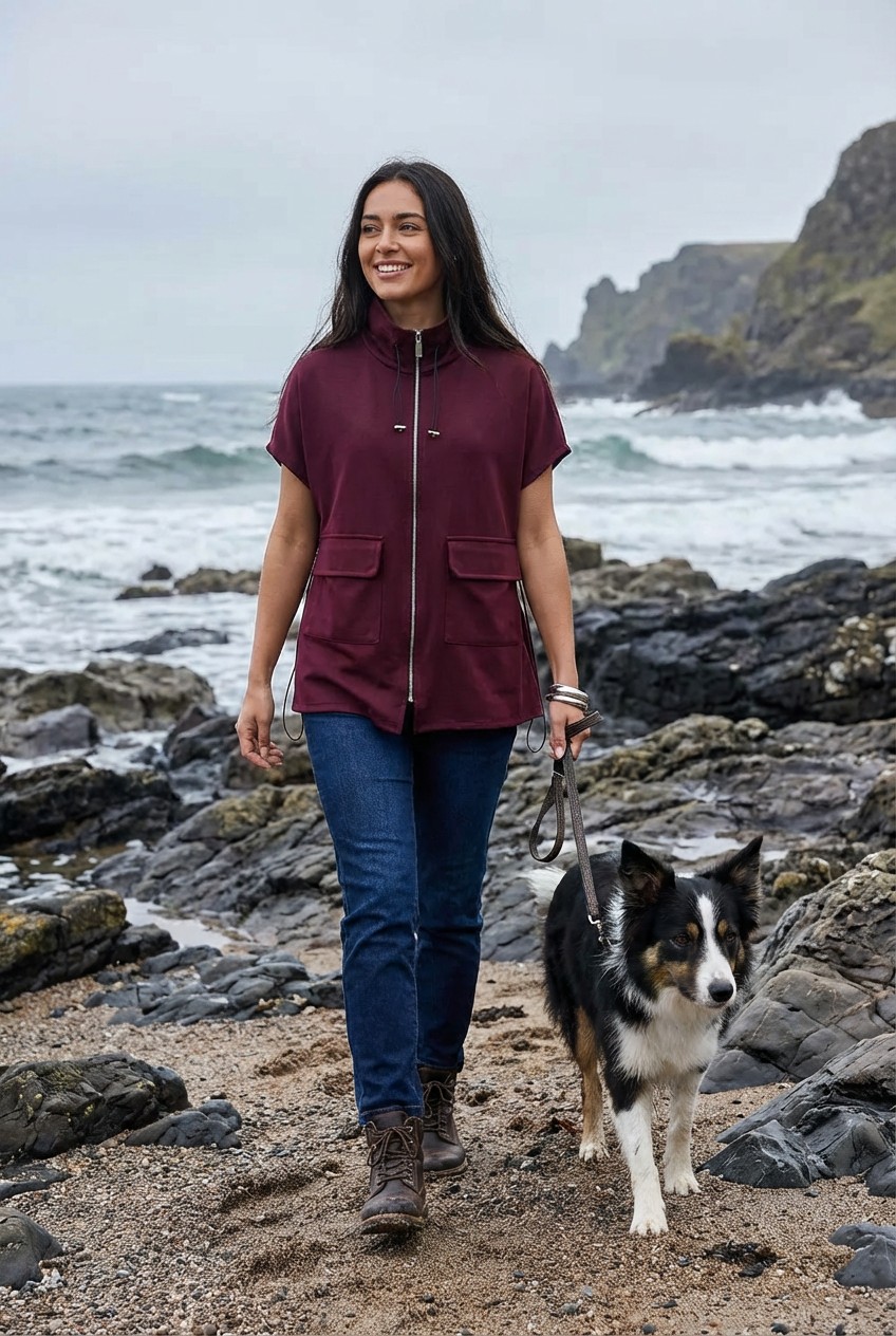 Our zip up short sleeved jacket is great for layering, wear over a lightweight jumper or long sleeved t shirt. It features a funnel neck with ties that can be worn up or down, two front pockets and elasticated ties to the back for adjustment. Available in wine, navy, beige, khaki or chocolate. One size fits 10-18.