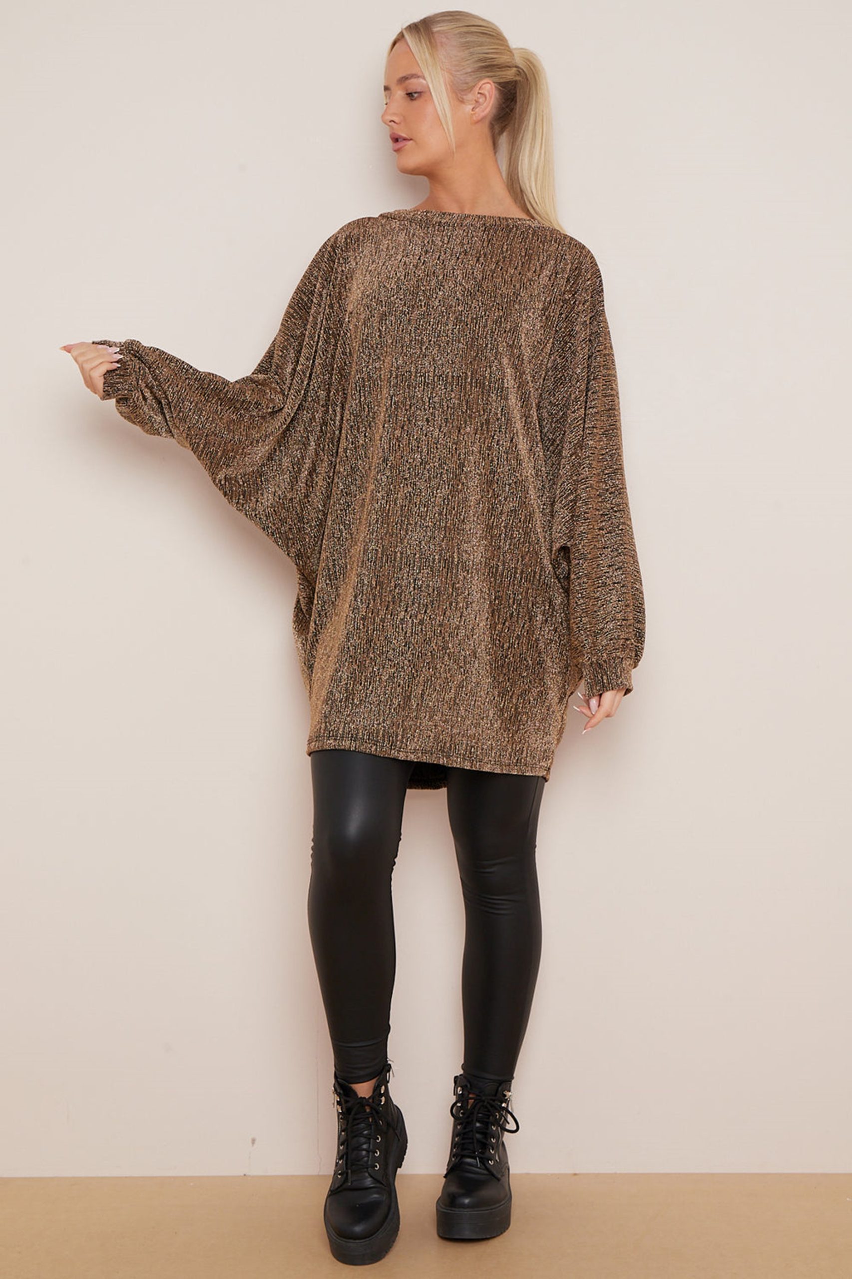 Perfect to wear with leggings our Italian longline glitter tunic. This oversized tunic has batwing sleeves and a round neck. Available in pink, green or gold. One Size 16-22.