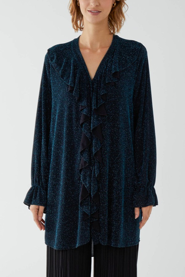 Our stunning glitter sparkle blouse has a button front with ruffles to the front and elasticated cuffs. Available in Teal or Wine. One size fits 18-24.