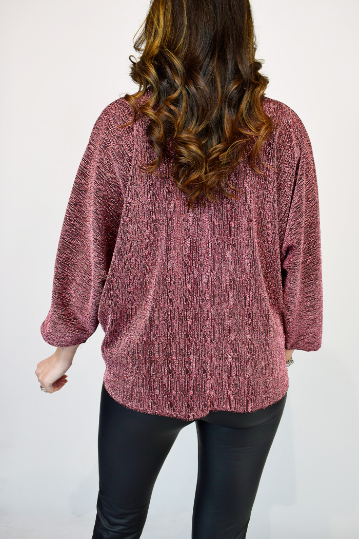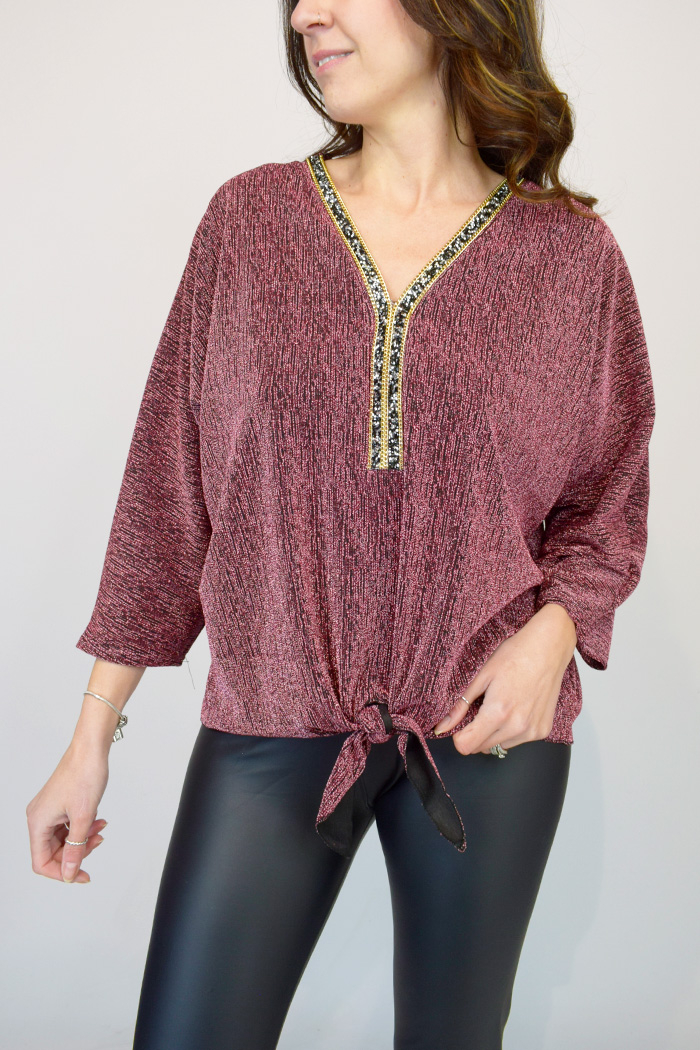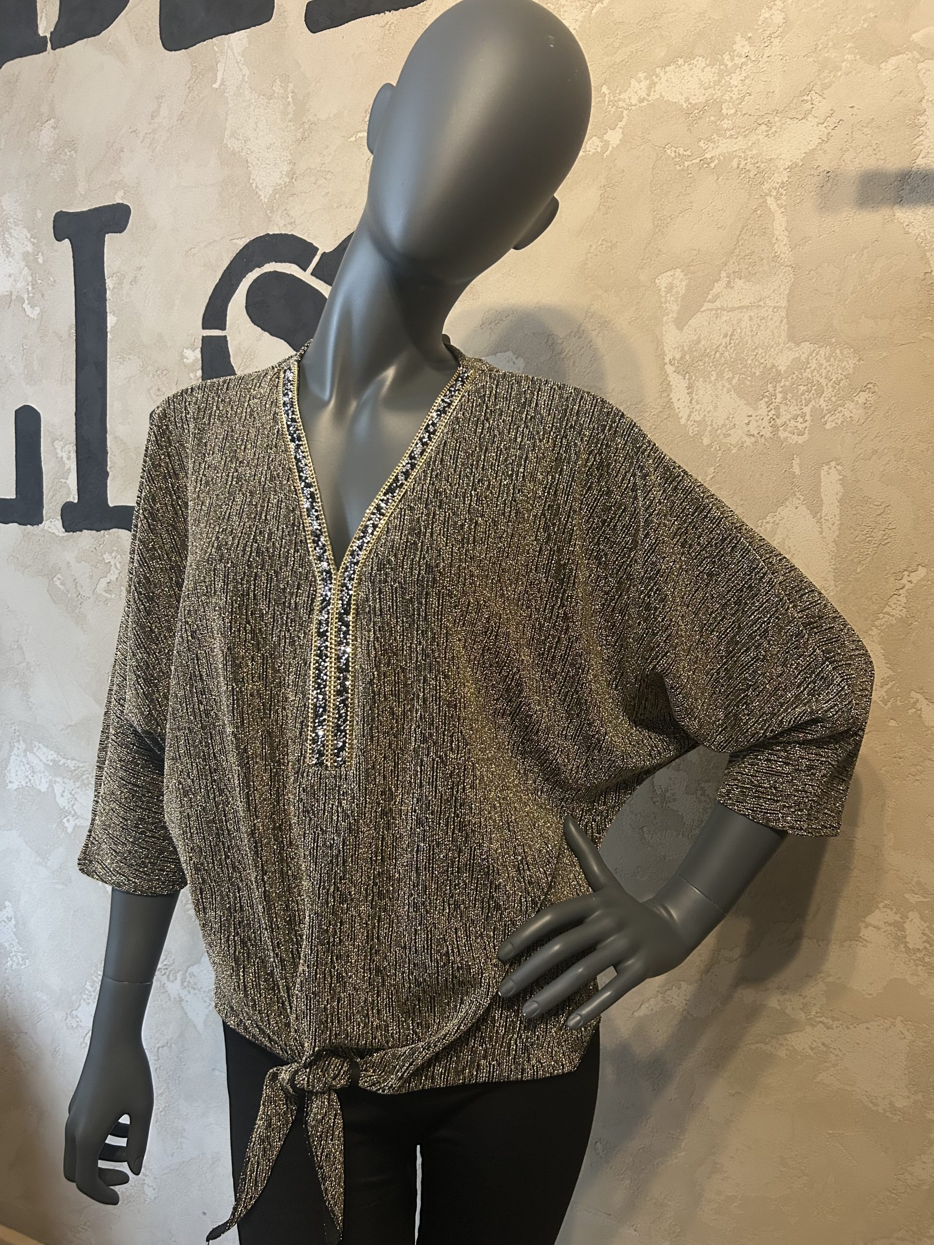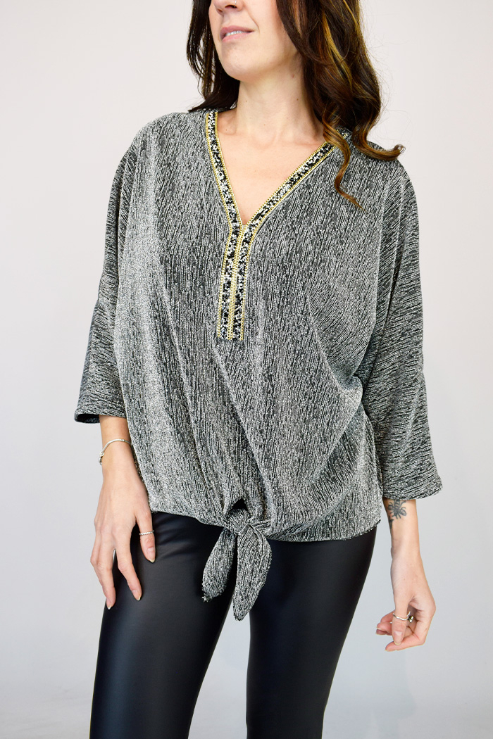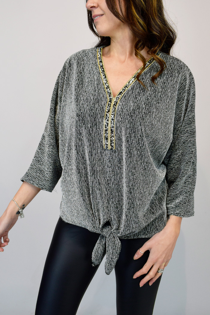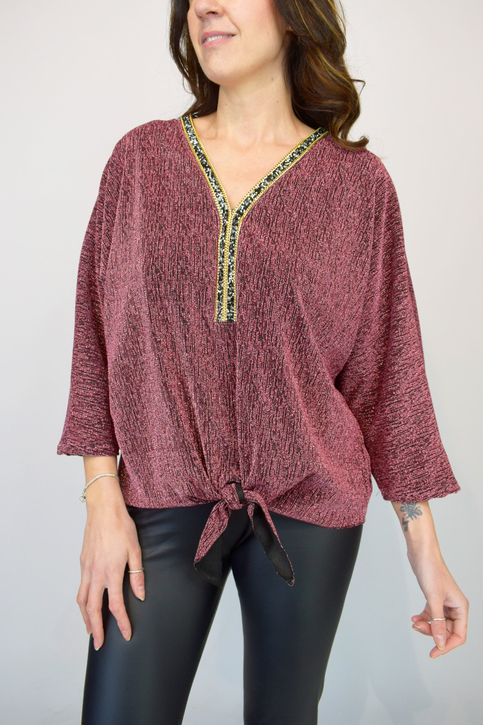 Our pretty glitter lurex top is great for a special occasion. It has a V front with glitter embellishment and tie front detail. Available in silver, blush pink and gold. One size 10-18