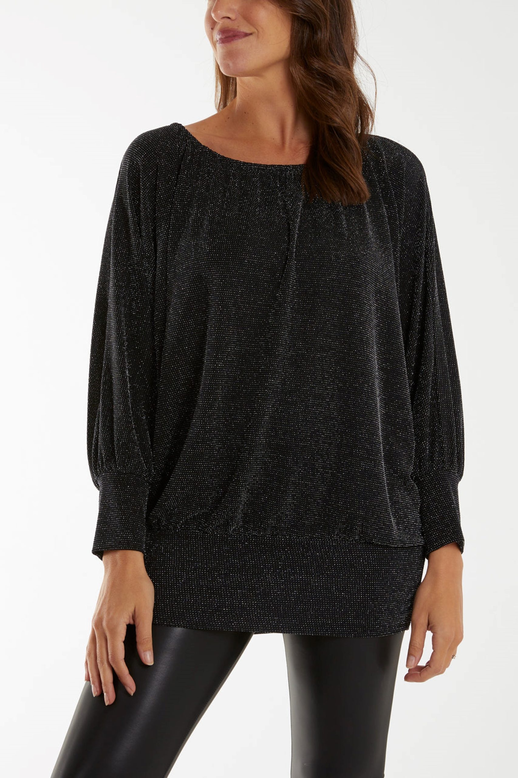 Our pretty glitter top is perfect for any special event. It features long sleeves with deep cuffs, a cuffed hem and a gentle round neck. Available in Black or Navy. One Size 14-18.