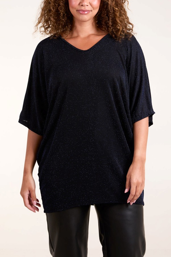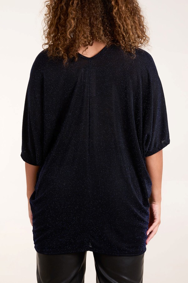 Our navy glitter tunic is perfect for the festive season. It has a soft V to both the front and the back. One size fits 16-24