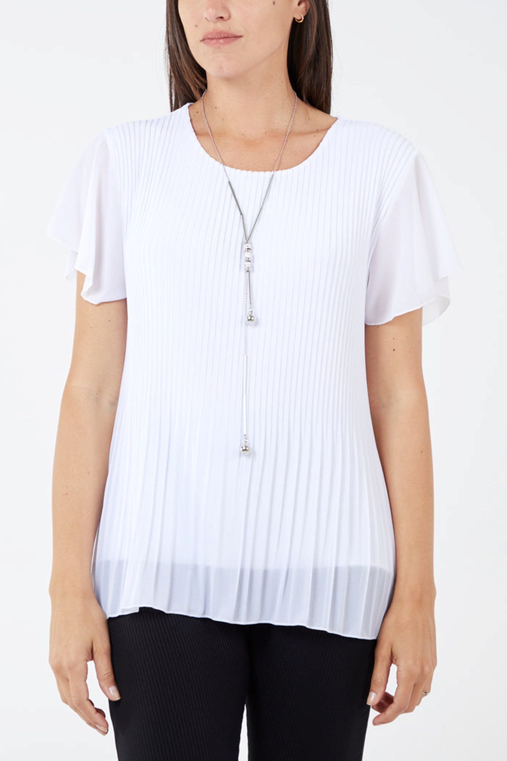 Our cute pleated top has short fluted sleeves and comes complete with a extremely pretty silver tone beaded necklace. Perfect to dress up or down.  One size 10 -16.