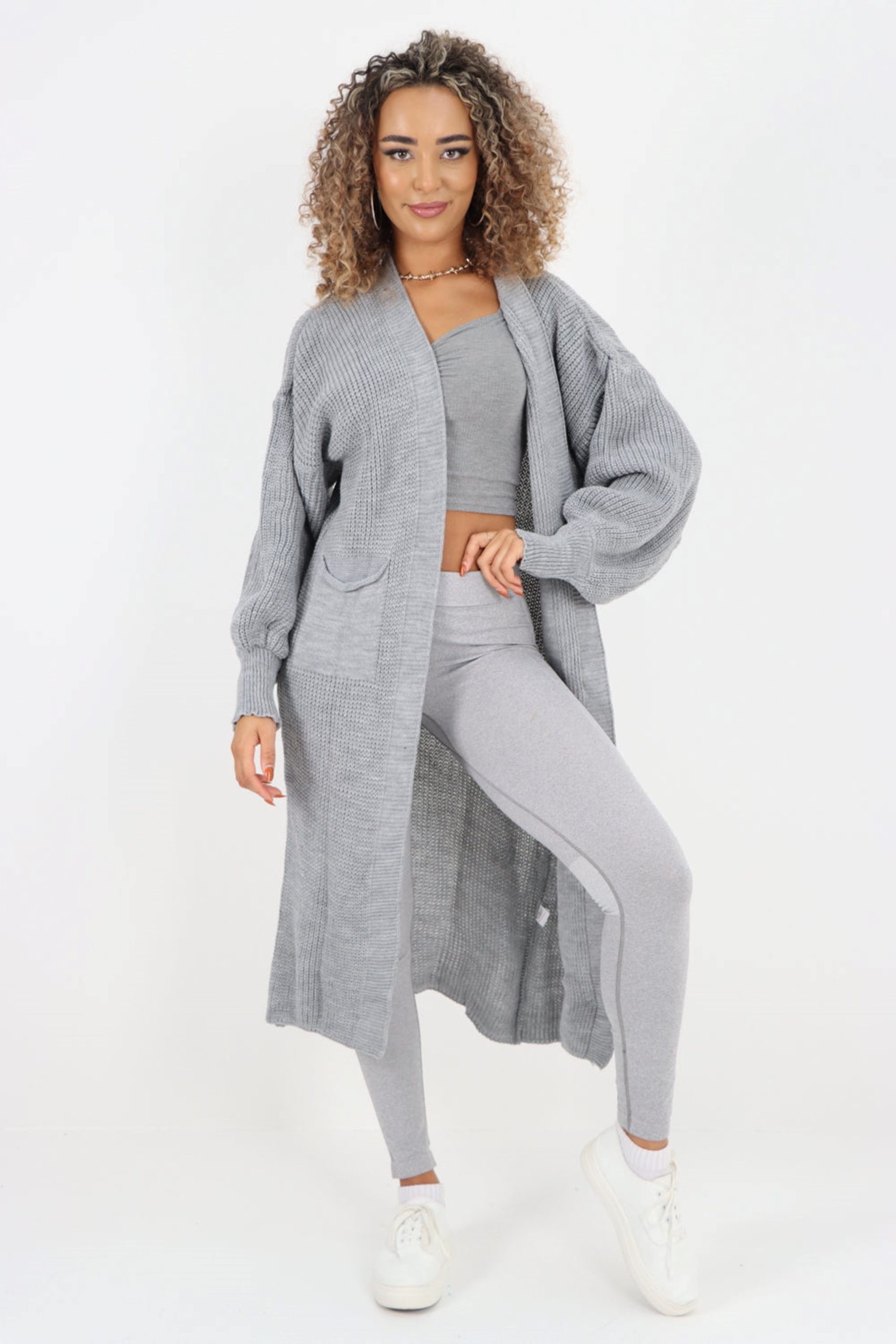 This grey oversized long line cardigan is perfect for Autumn or Winter days. This cardigan is On Trend with it’s Bubble Sleeves. Looks great with a dress and boots and equally as fabulous with jeans. One size 10-18