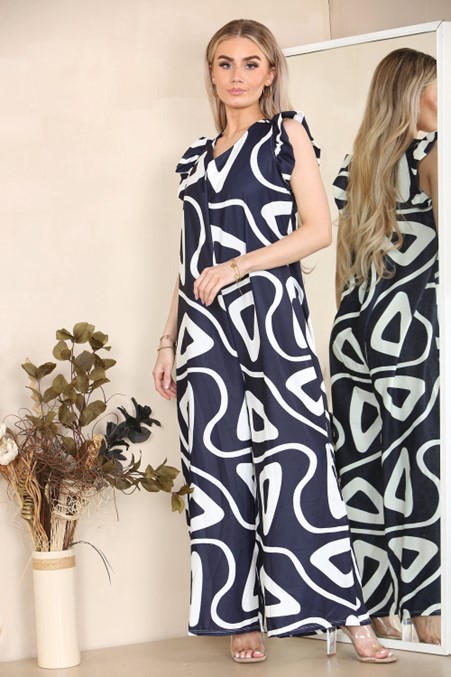 Our stunning stretchy jumpsuit features an unusual swirl pattern and cute ruffle sleeves. It has wide legs, a v neck and ties at the back. Perfect for looking extra glamourous on your holidays. Available in Navy/White or White/Black print. One size 10-18.