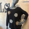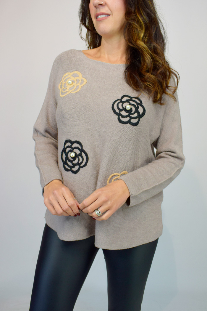 Our cosy mocha jumper has a round neckline with black and beige ribbon applique flowers finished with a pearl to the centre. One size fits 10-16.