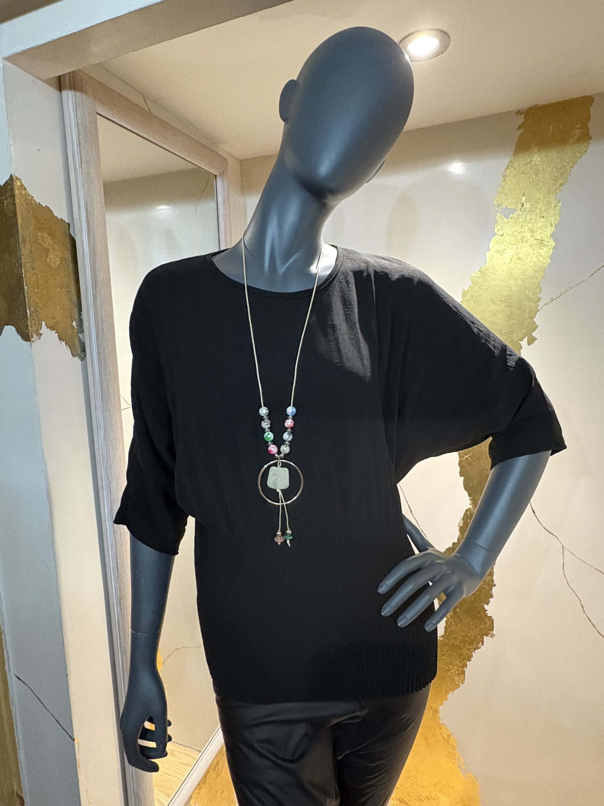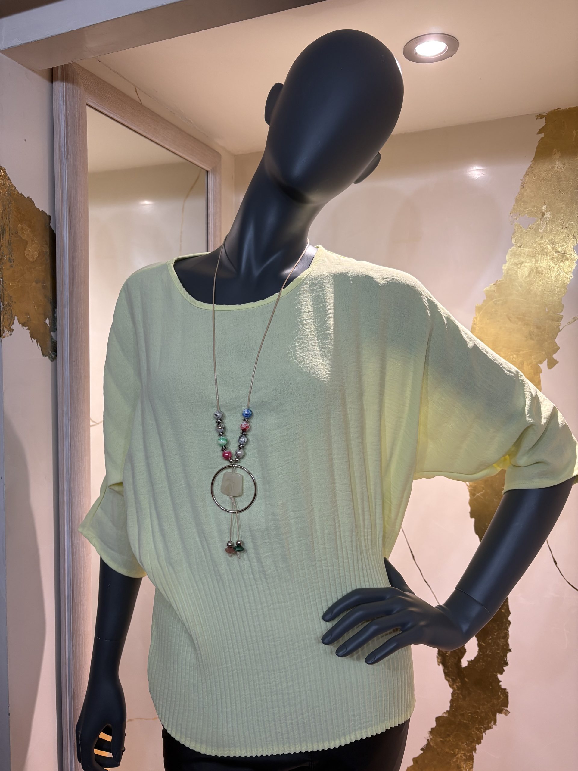 This beautiful blouse in a stretch fabric features delicate pleated throughout and a pretty beaded necklace. Available in lemon or black. One size fits 10-16.