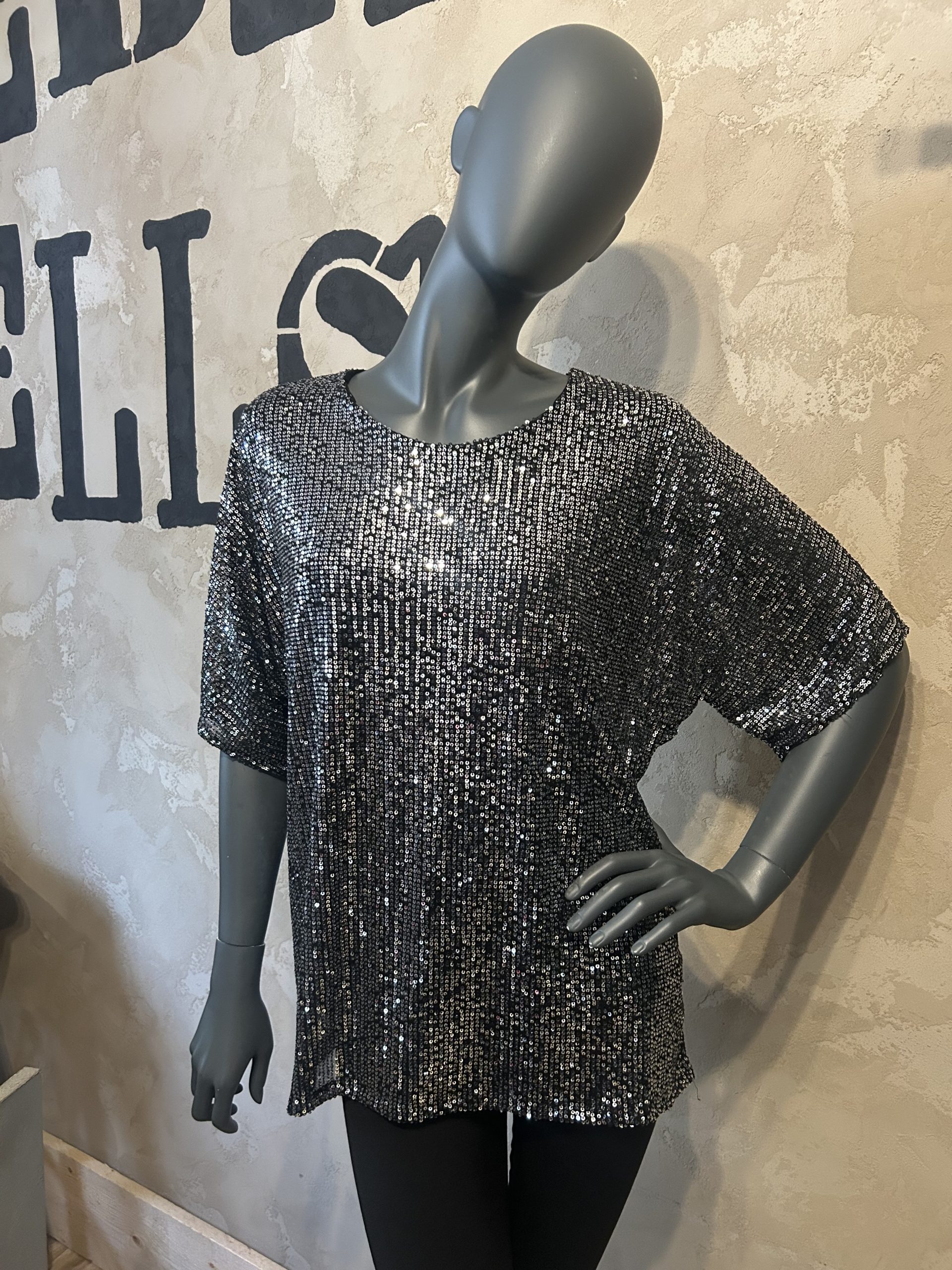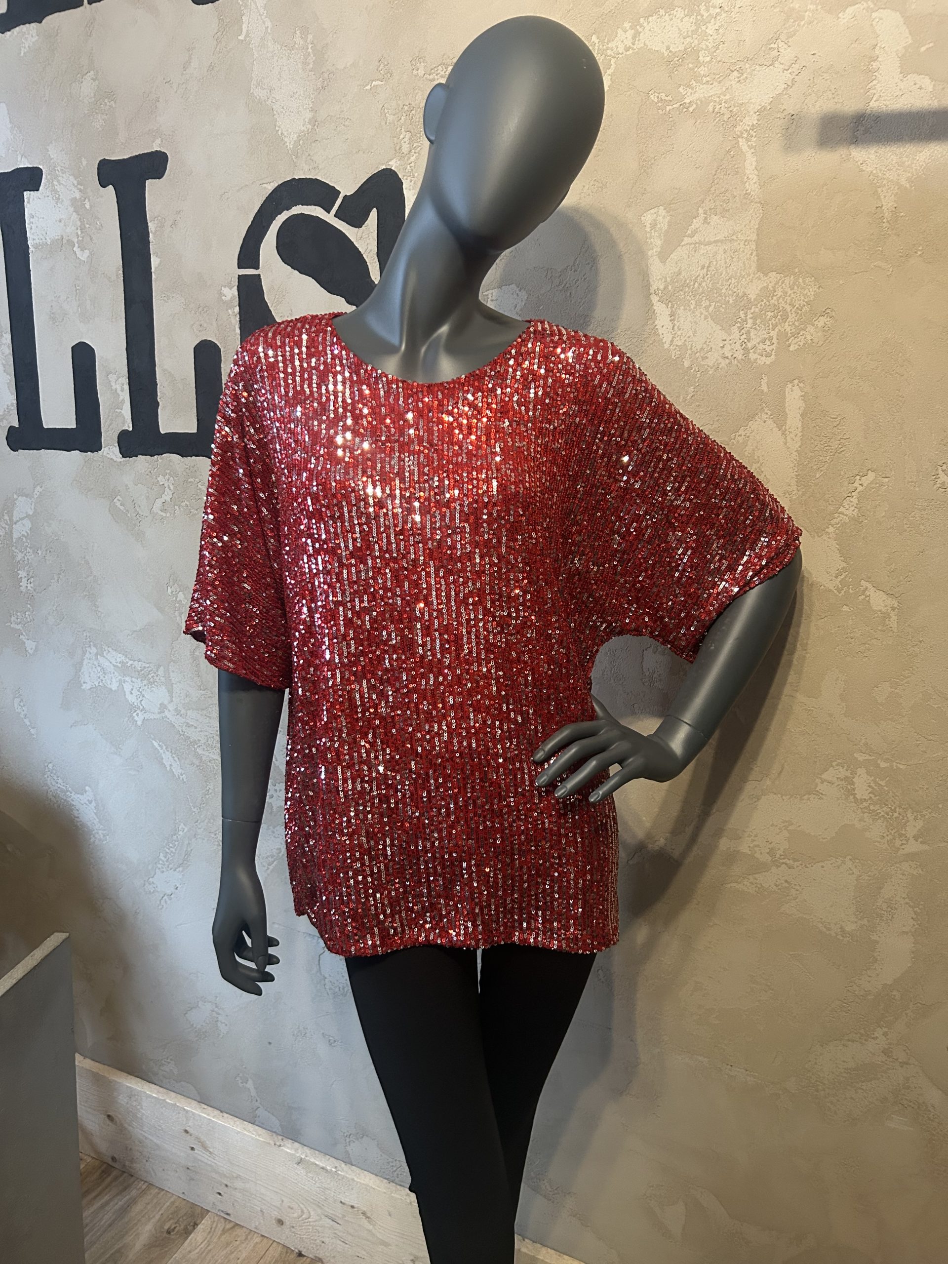Our sequin top is perfect for any special occasion. It has a round neck and short sleeves. Available in black or red, one size fits 10-16.