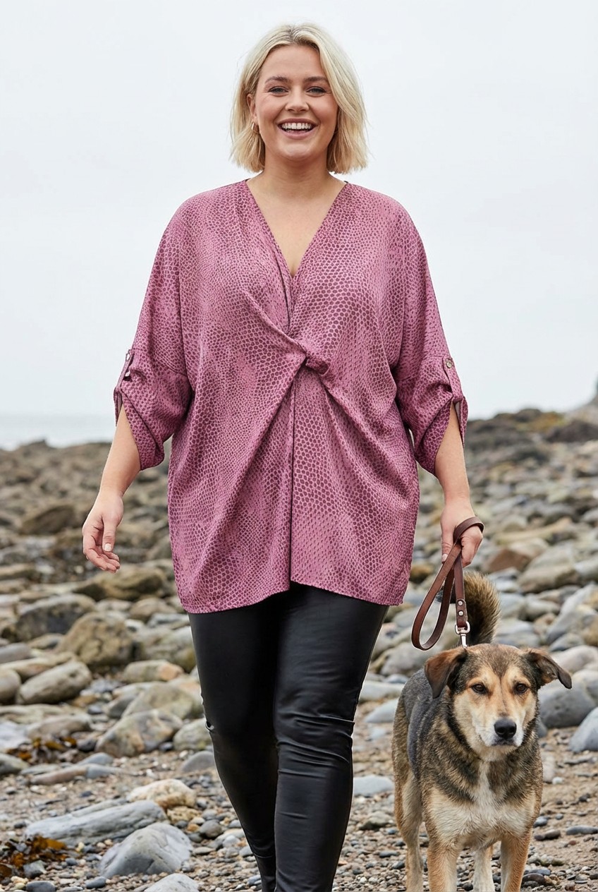 Our loose, kimono-style top, characterised by its relaxed, draping silhouette and a rich, dusty rose or blue hue with a subtle animal print adds visual interest. The fabric light weight and breathable, making it ideal for layering or wearing solo in warmer weather. Notable details include a V-neckline and rolled-up sleeves secured with a simple button tab, adding a touch of casual elegance. This versatile piece is perfect for casual outings or dressed up for a chic evening look. Pair it with tailored pants or sleek leggings to highlight its voluminous design for a balanced and effortlessly stylish ensemble. Available in Pink and Blue in One Size 16-24.