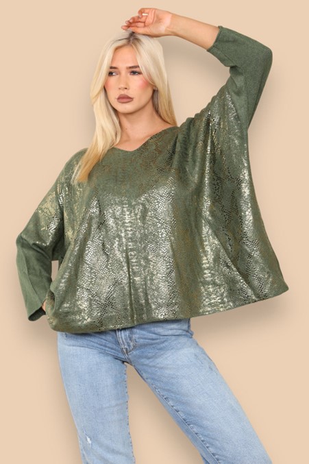 This fantastic v neck jumper is super soft. It has a delicate snakeskin foil print effect to the front and tops of the sleeves with a hint of sparkle. It is available in Khaki.  One Size 14-20.