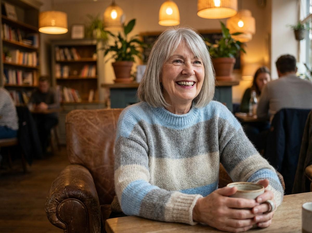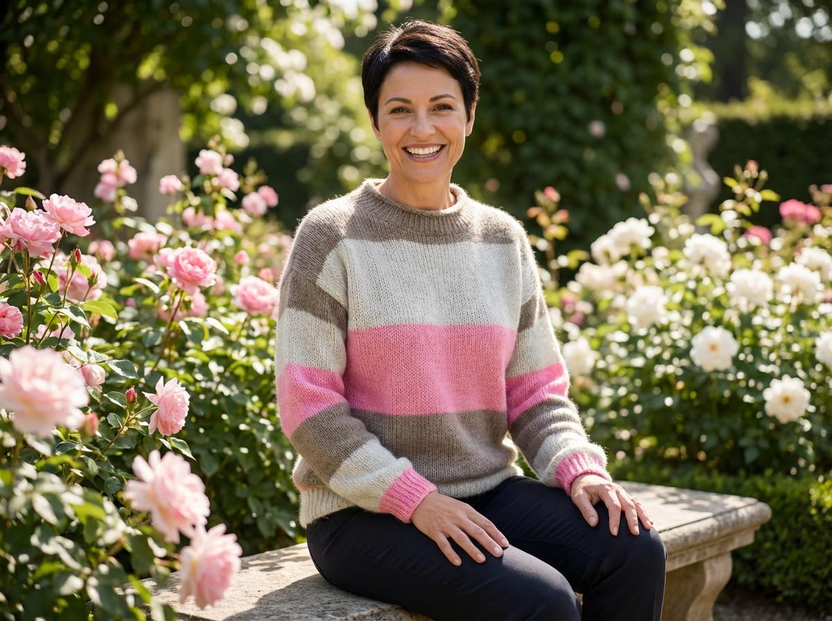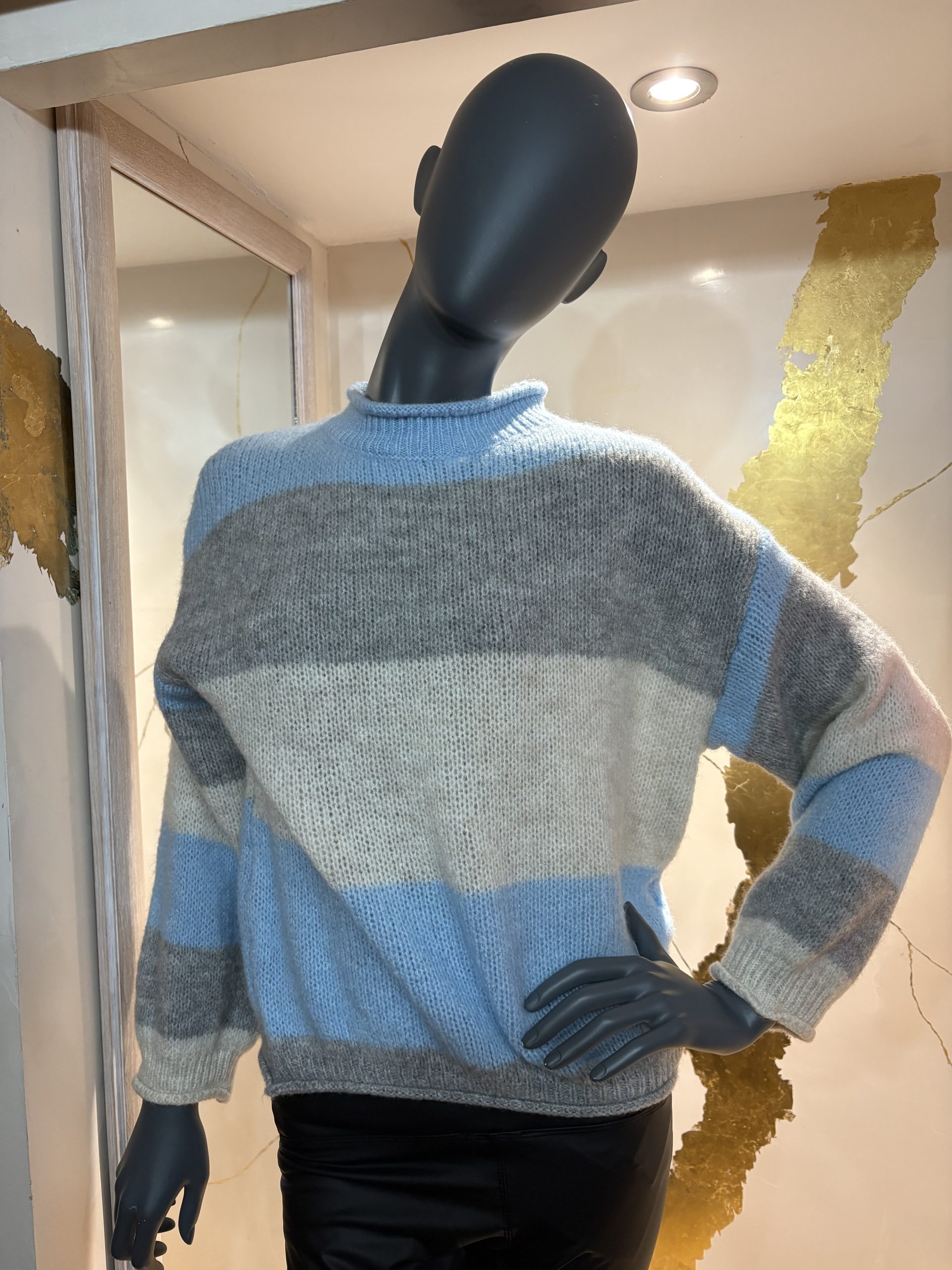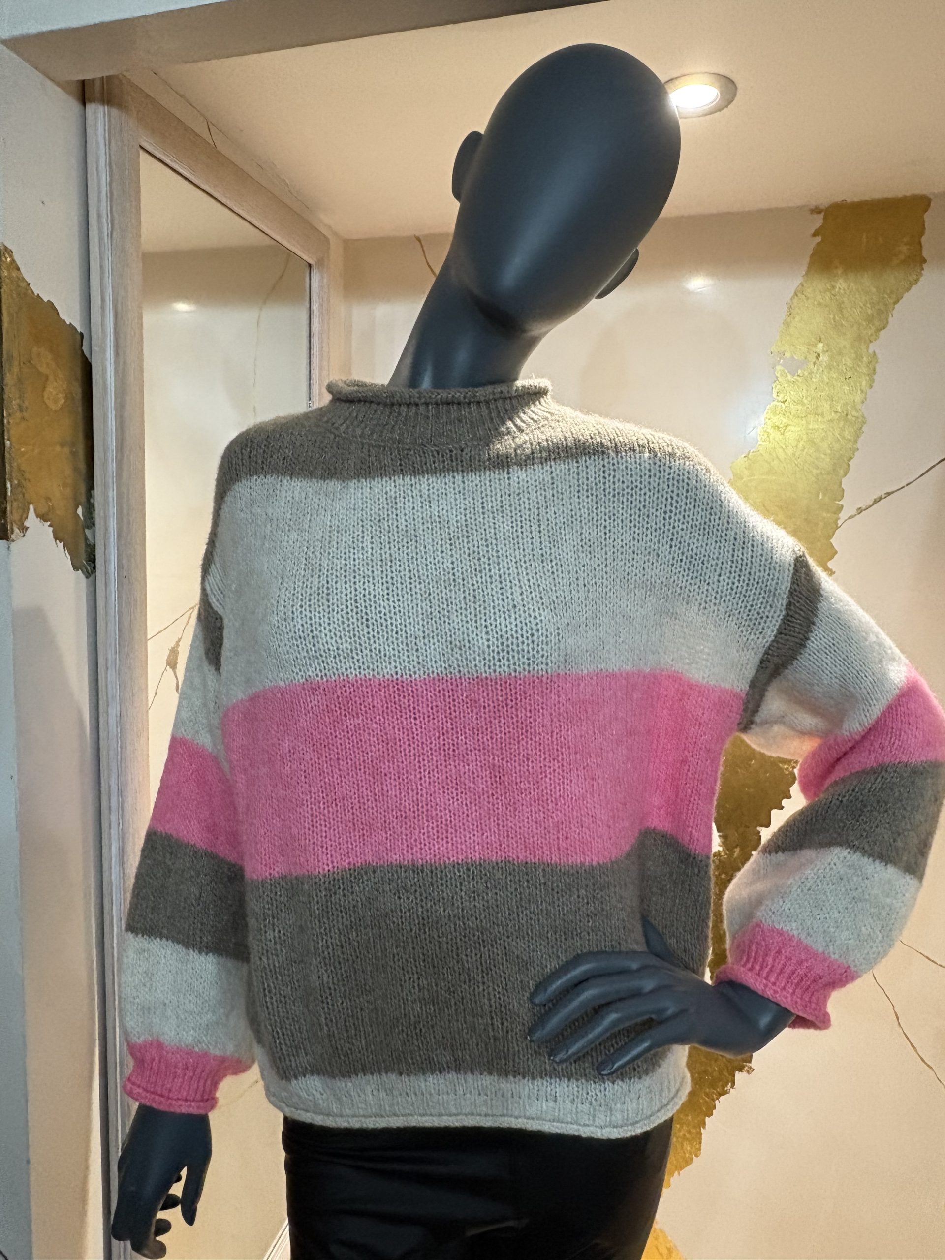 Our cosy Italian crew neck jumper features stripe detail. Available in pink/mocha/beige or blue/stone/grey. One size fits 10-16
