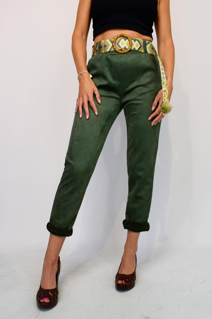 These suede effect trousers have a beautiful feel. They have an elasticated waist, 2 side pockets and a fabulous Aztec belt. Available in khaki or rust.