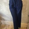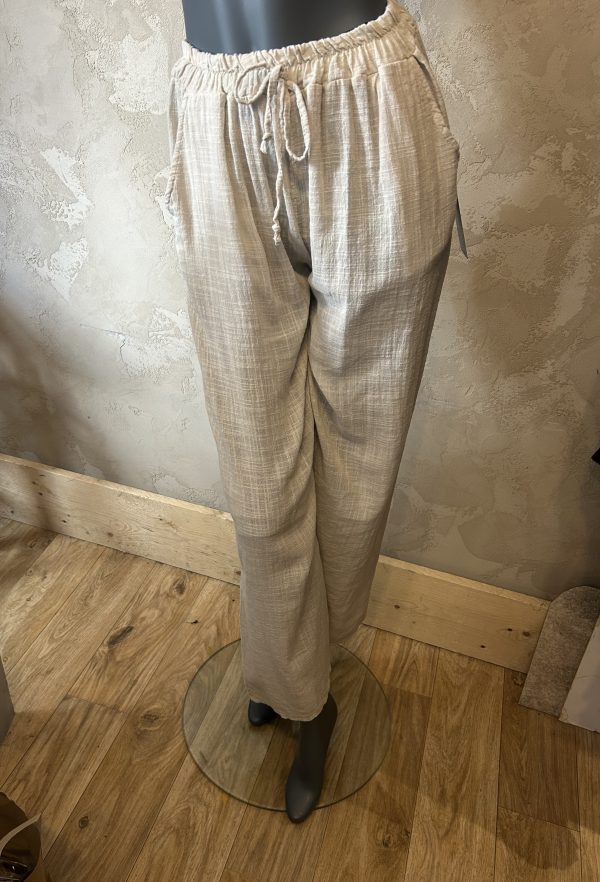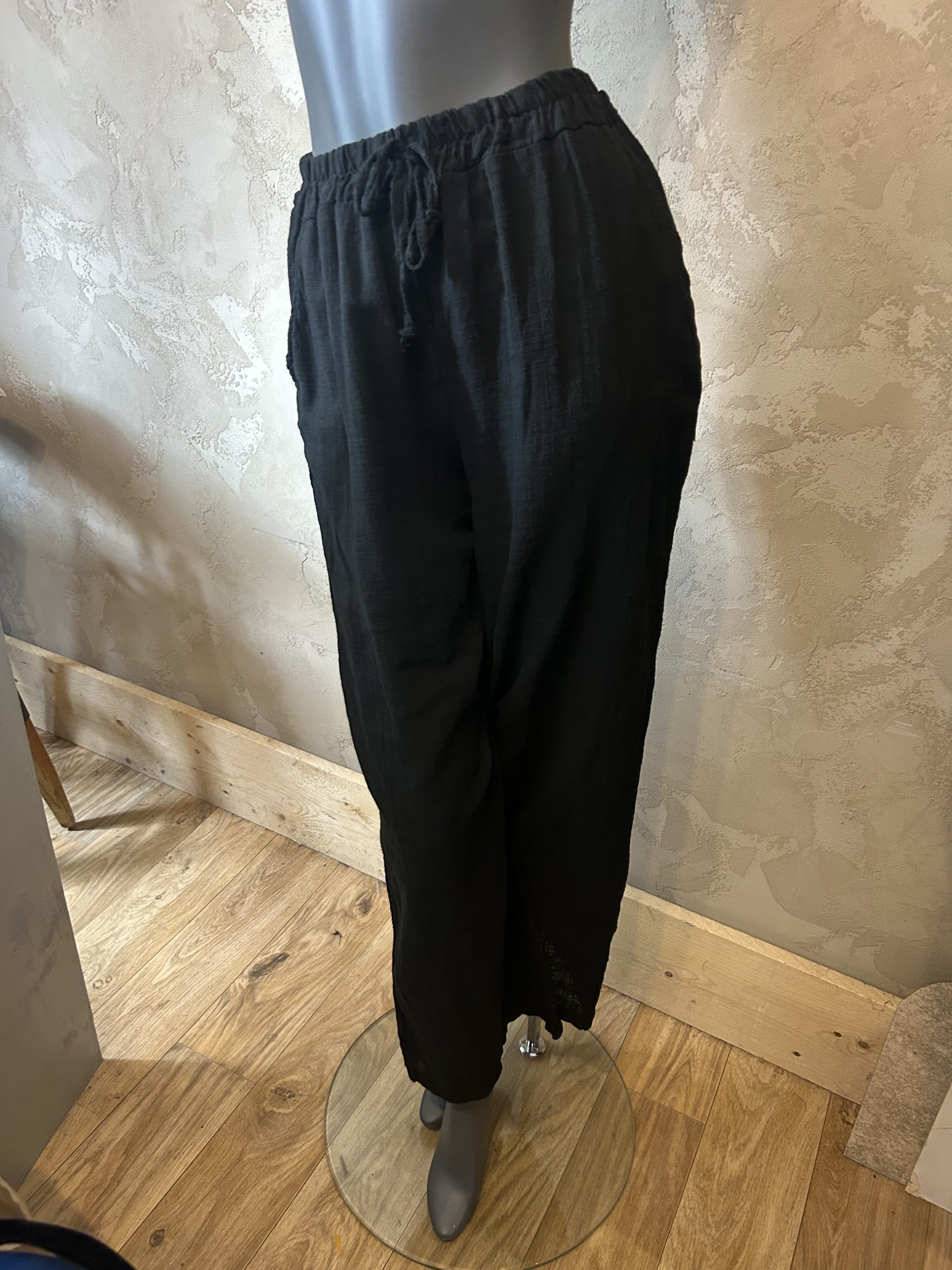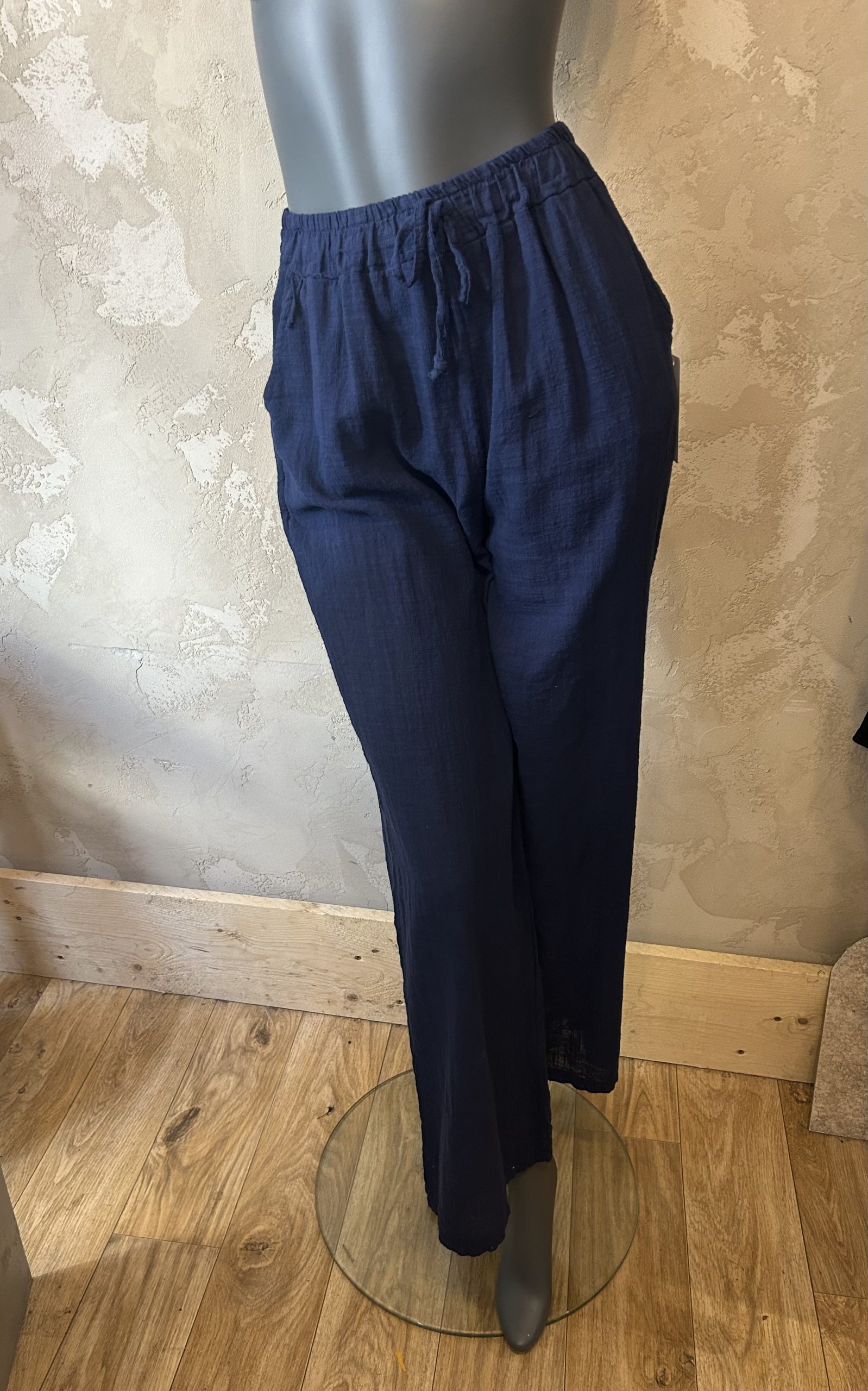 Our lightweight wide leg Italian cotton trouser have an elasticated drawstring waist and side pockets.  Available in navy, black or stone.  One size fits 10-16.